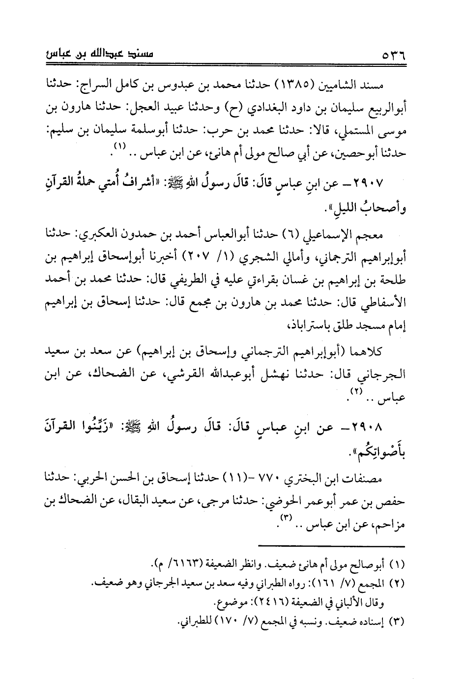 2907 - عن ابنِ عباسٍ قالَ: قالَ رسولُ اللهِ صلى الله عليه وسلم: «أشرافُ أُمتي حملةُ القرآنِ وأصحابُ الليلِ».