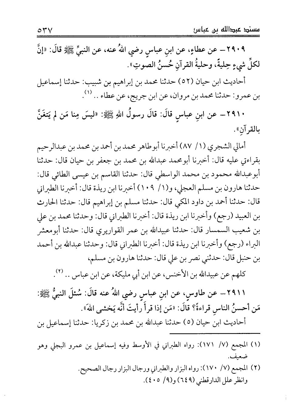 2910 - عن ابنِ عباسٍ قالَ: قالَ رسولُ اللهِ صلى الله عليه وسلم: «ليسَ مِنا مَن لم يَتغَنَّ بالقرآنِ».