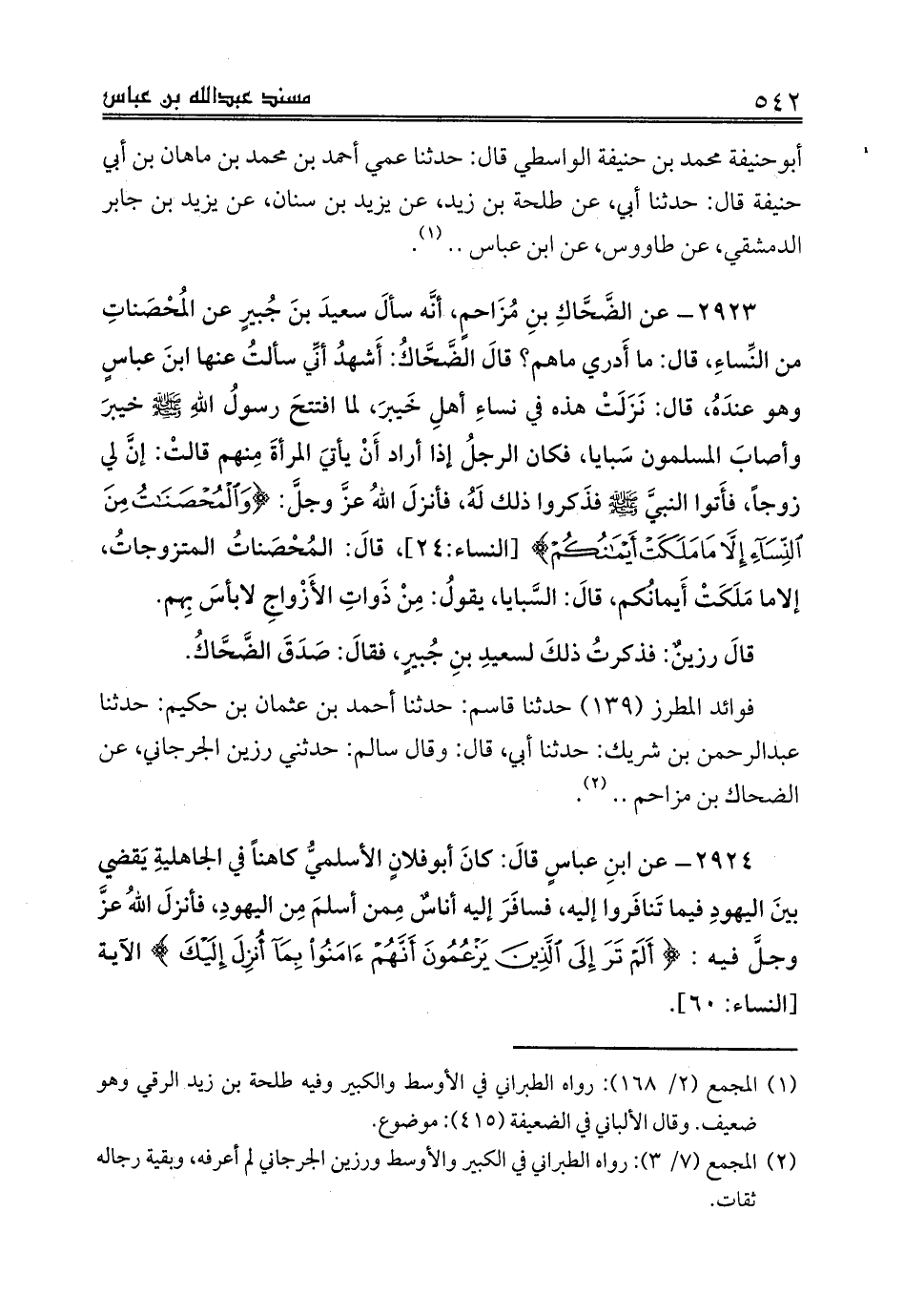 2923 - عن الضَّحَّاكِ بنِ مُزَاحمٍ، أنَّه سألَ سعيدَ بنَ جُبيرٍ عن المُحْصَناتِ من النِّساءِ، قال: ما أَدري ماهم؟ قالَ الضَّحَّاكُ: أَشهدُ أنِّي سألتُ عنها ابنَ عباسٍ وهو عندَهُ، قال: نَزَلَتْ هذه في نساءِ أهلِ خَيبرَ، لما افتتحَ رسولُ اللهِ صلى الله عليه وسلم خيبرَ وأصابَ المسلمون سَبايا، فكان الرجلُ إذا أراد أَنْ يأتيَ المرأةَ مِنهم قالتْ: إنَّ لي زوجاً، فأَتوا النبيَّ صلى الله عليه وسلم فذَكروا ذلك لَهُ، فأنزلَ اللهُ عزَّ وجلَّ: {وَالْمُحْصَنَاتُ مِنَ النِّسَاءِ إِلَّا مَا مَلَكَتْ أَيْمَانُكُمْ} [النساء:24]، قالَ: المُحْصَناتُ المتزوجاتُ، إلاما مَلَكَتْ أَيمانُكم، قالَ: السَّبايا، يقولُ: مِنْ ذَواتِ الأَزْواجِ لابأسَ بِهم.