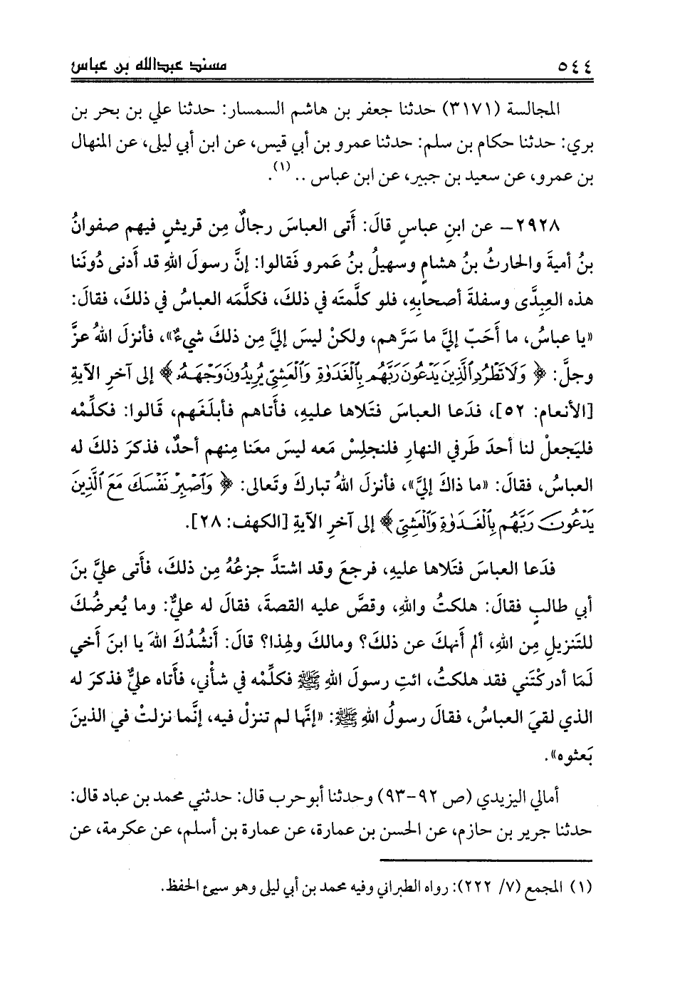 2928 - عن ابنِ عباسٍ قالَ: أَتى العباسَ رجالٌ مِن قريشٍ فيهم صفوانُ بنُ أميةَ والحارثُ بنُ هشامٍ وسهيلُ بنُ عَمرو فَقالوا: إنَّ رسولَ اللهِ قد أَدنى دُونَنا هذه العِبِدَّى وسفلةَ أصحابِهِ، فلو كلَّمتَه في ذلكَ، فكلَّمَه العباسُ في ذلكَ، فقالَ: «يا عباسُ، ما أَحَبّ إليَّ ما سَرَّهم، ولكنْ ليسَ إليَّ مِن ذلكَ شيءٌ»، فأنزلَ اللهُ عزَّ وجلَّ: {وَلَا تَطْرُدِ الَّذِينَ يَدْعُونَ رَبَّهُمْ بِالْغَدَاةِ وَالْعَشِيِّ يُرِيدُونَ وَجْهَهُ} إلى آخرِ الآيةِ [الأنعام: 52]، فدَعا العباسَ فتَلاها عليهِ، فأَتاهم فأبلَغَهم، قَالوا: فكلِّمْه فليَجعلْ لنا أحدَ طَرفي النهارِ فلنجلِسْ مَعه ليسَ معَنا مِنهم أحدٌ، فذكرَ ذلكَ له العباسُ، فقالَ: «ما ذاكَ إليَّ»، فأنزلَ اللهُ تباركَ وتَعالى: {وَاصْبِرْ نَفْسَكَ مَعَ الَّذِينَ يَدْعُونَ رَبَّهُمْ بِالْغَدَاةِ وَالْعَشِيِّ} إلى آخرِ الآيةِ [الكهف: 28].