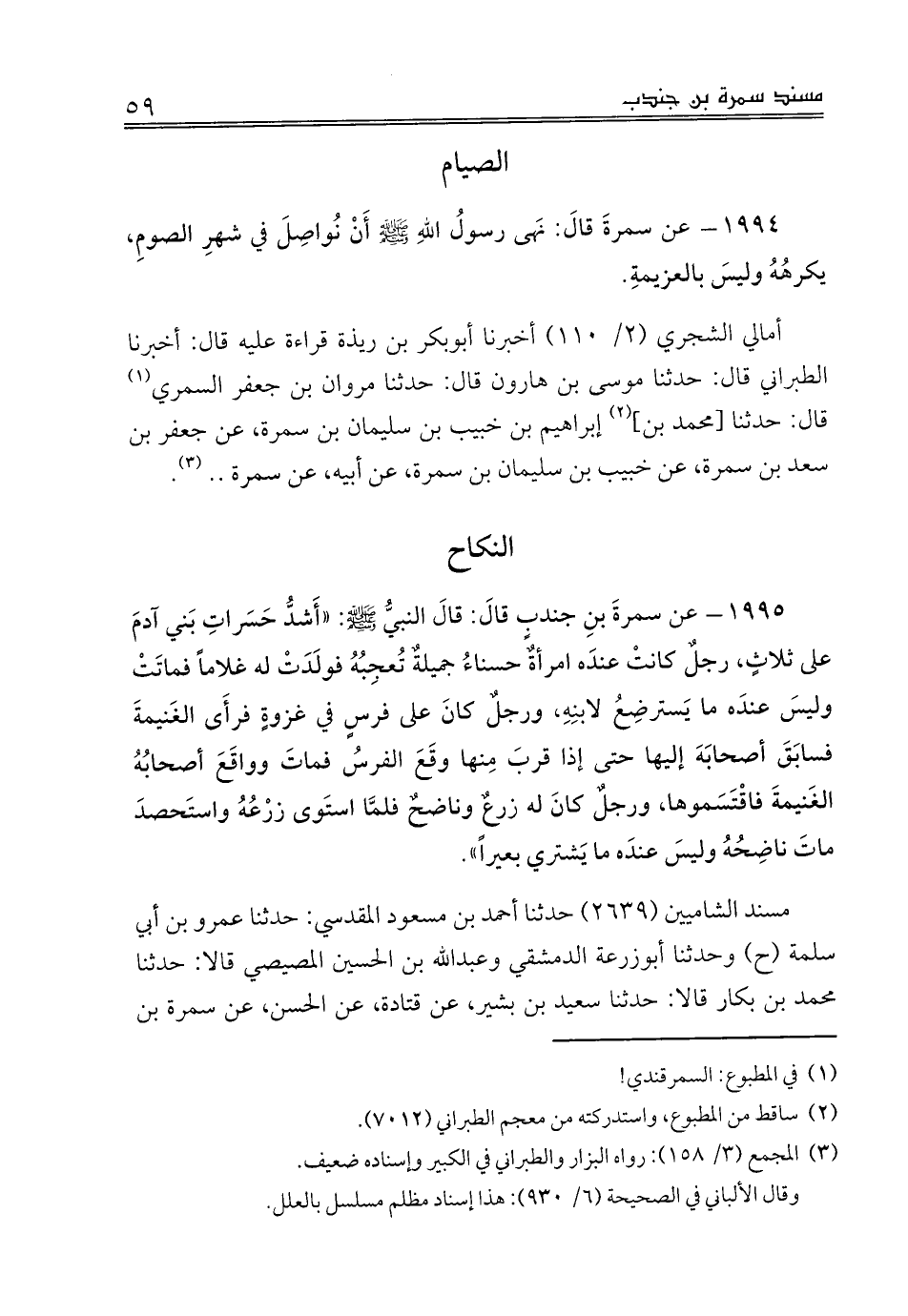 1994 - عن سمرةَ قالَ: نَهى رسولُ اللهِ صلى الله عليه وسلم أَنْ نُواصِلَ في شهرِ الصومِ، يكرهُهُ وليسَ بالعزيمةِ.