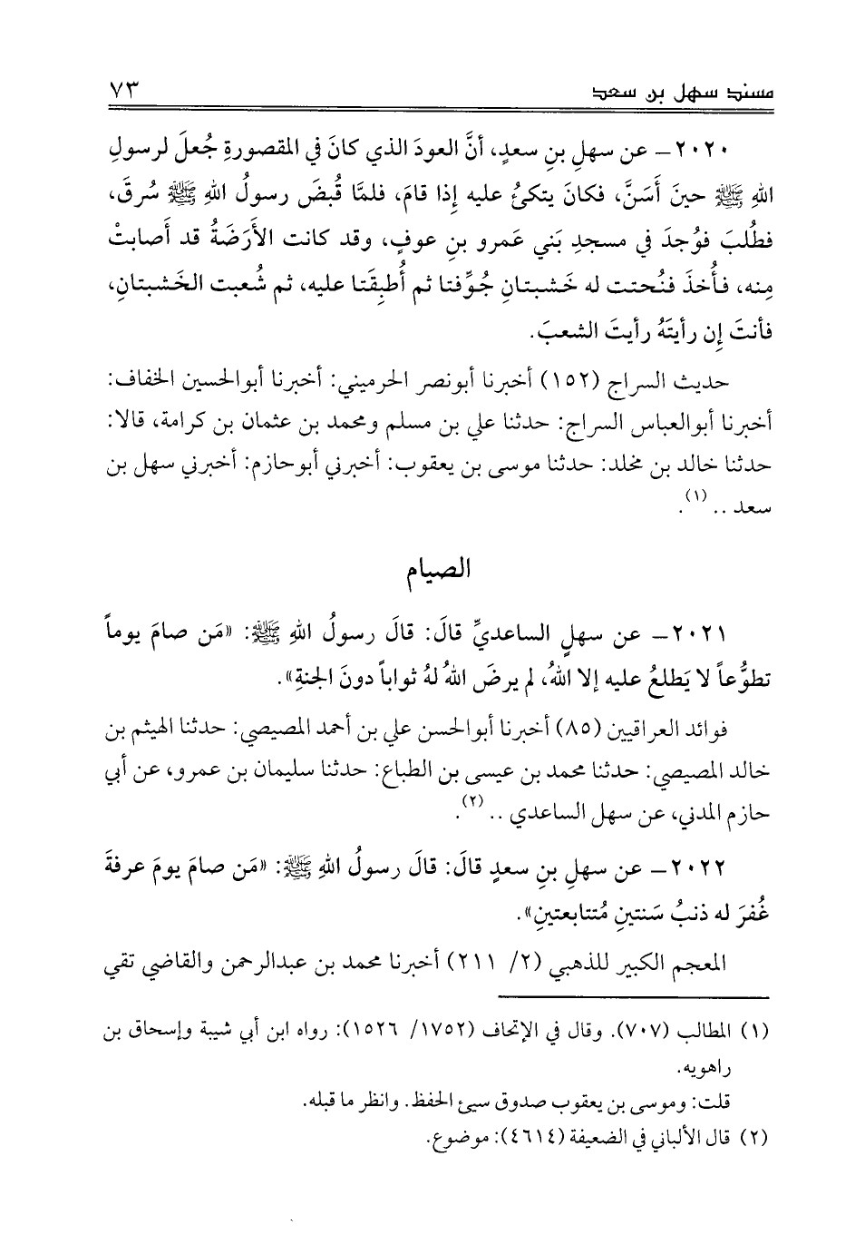 حديث السراج (152) أخبرنا أبونصر الحرميني: أخبرنا أبوالحسين الخفاف: أخبرنا أبوالعباس السراج: حدثنا علي بن مسلم ومحمد بن عثمان بن كرامة، قالا: حدثنا خالد بن مخلد: حدثنا موسى بن يعقوب: أخبرني أبوحازم: أخبرني سهل بن سعد .. (¬1).