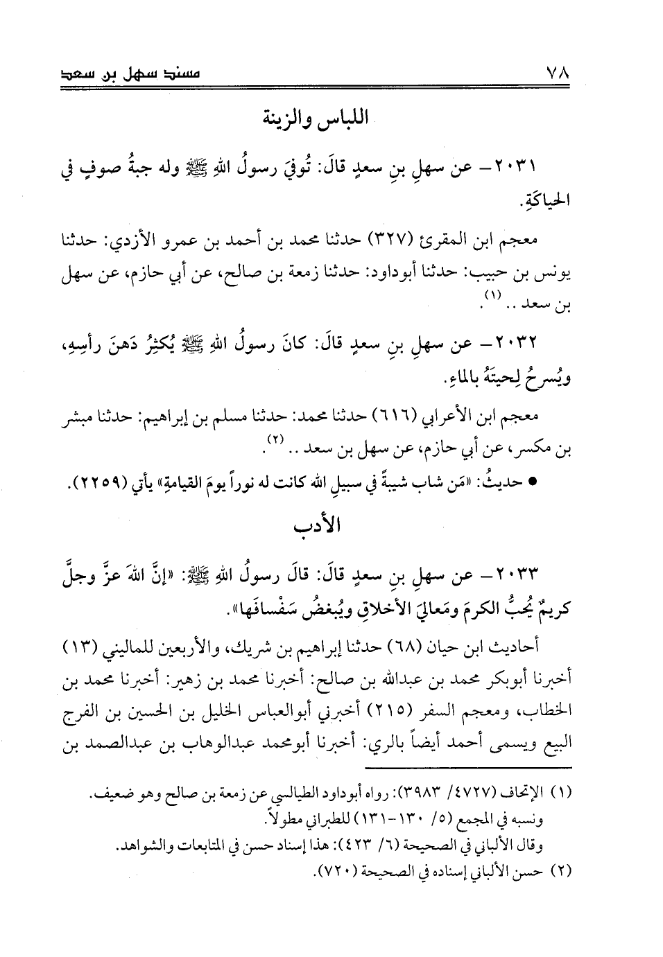 2032 - عن سهلِ بنِ سعدٍ قالَ: كانَ رسولُ اللهِ صلى الله عليه وسلم يُكثِرُ دَهنَ رأسِهِ، ويُسرحُ لِحيتَهُ بالماءِ.