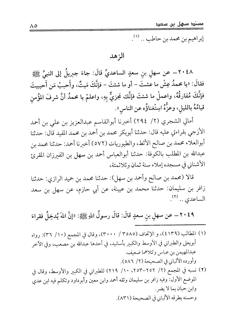2049 - عن سهلِ بنِ سعدٍ قالَ: قالَ رسولُ اللهِ صلى الله عليه وسلم: «إنَّ اللهَ يُدخِلُ فقراءَ