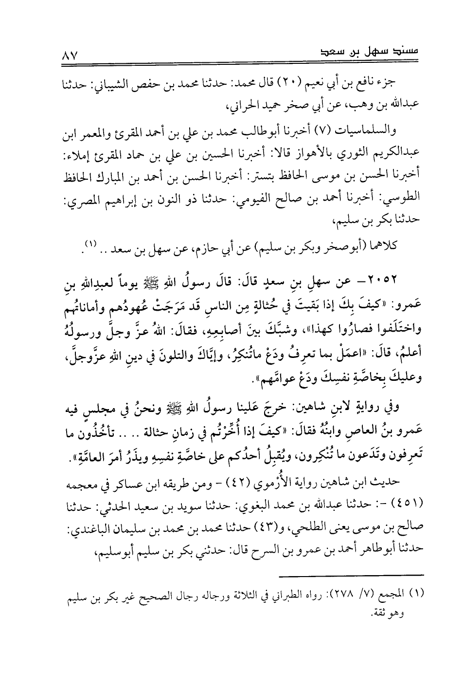 حديث ابن شاهين رواية الأُرْموي (42) - ومن طريقه ابن عساكر في معجمه (451) -: حدثنا عبدالله بن محمد البغوي: حدثنا سويد بن سعيد الحدثي: حدثنا صالح بن موسى يعنى الطلحي، و (43) حدثنا محمد بن محمد بن سليمان الباغندي: حدثنا أبوطاهر أحمد بن عمرو بن السرح قال: حدثني بكر بن سليم أبوسليم،