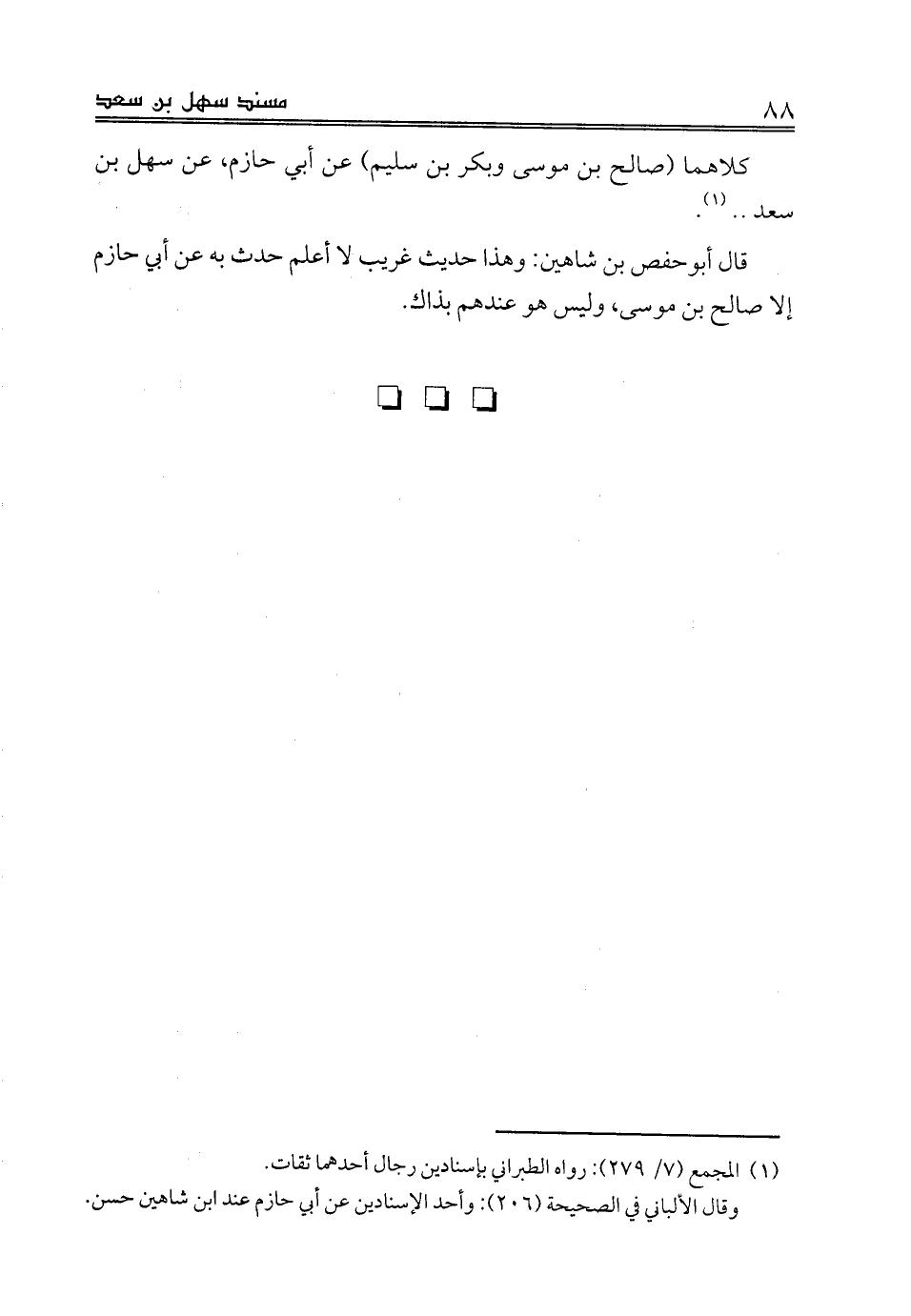 وقال الألباني في الصحيحة (206): وأحد الإسنادين عن أبي حازم عند ابن شاهين حسن.