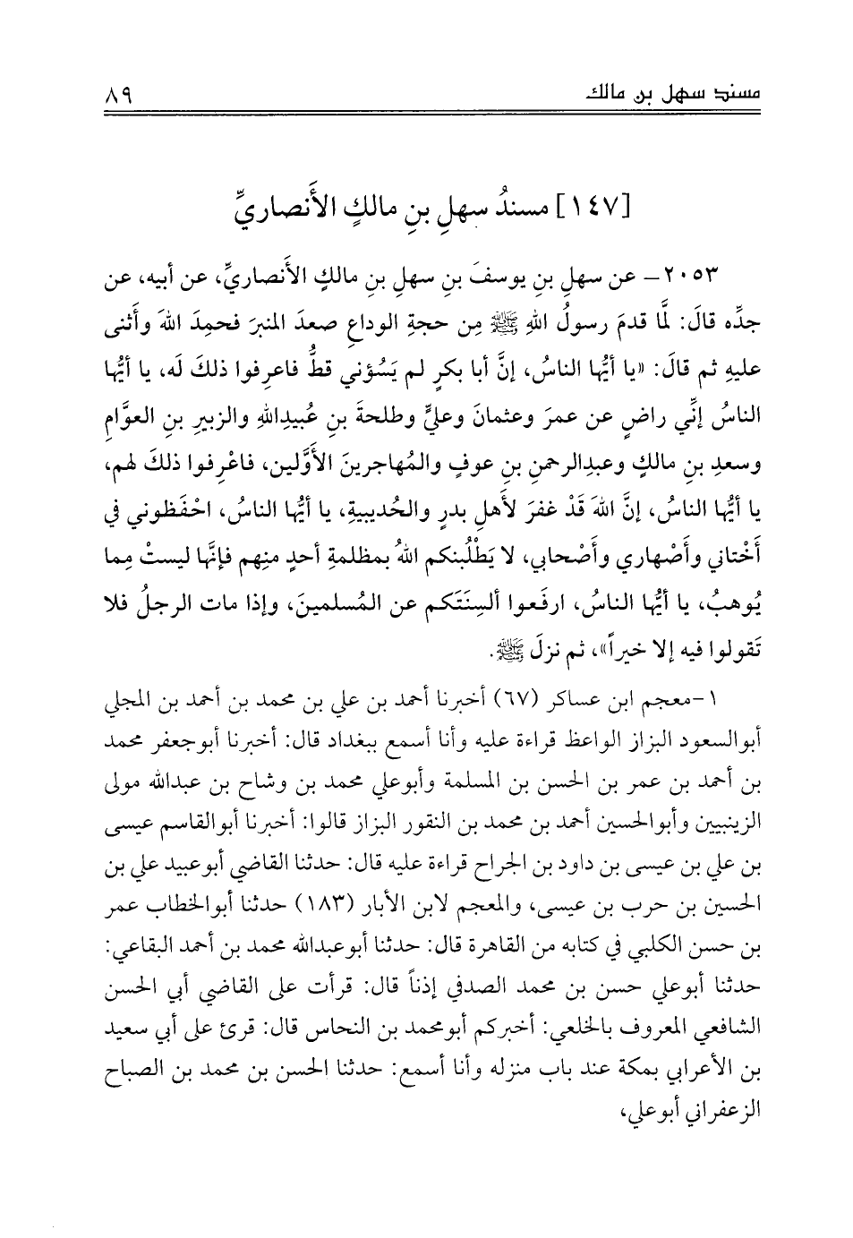 [147] مسندُ سهلِ بنِ مالكٍ الأَنصاريِّ