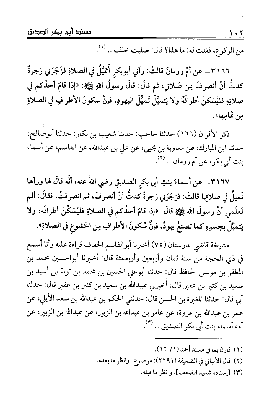 3167 - عن أسماءَ بنتِ أبي بكرٍ الصديقِ رضي اللهُ عنه، أنَّه قالَ لها ورآها تَميلُ في صلاتِها قالتْ: فزجَرَني زجرةً كدتُّ أنْ أنصرفَ، ثم انصرفتُ، فقالَ: ألم تَعلَمي أنَّ رسولَ الله صلى الله عليه وسلم قالَ: «إذا قامَ أحدُكم في الصلاةِ فليُسَكِّنْ أطرافَه، ولا يَتميِّلْ بجسدِهِ كما تصنعُ يهودُ، فإنَّ سُكونَ الأطرافِ مِن الخشوعِ في الصلاةِ».