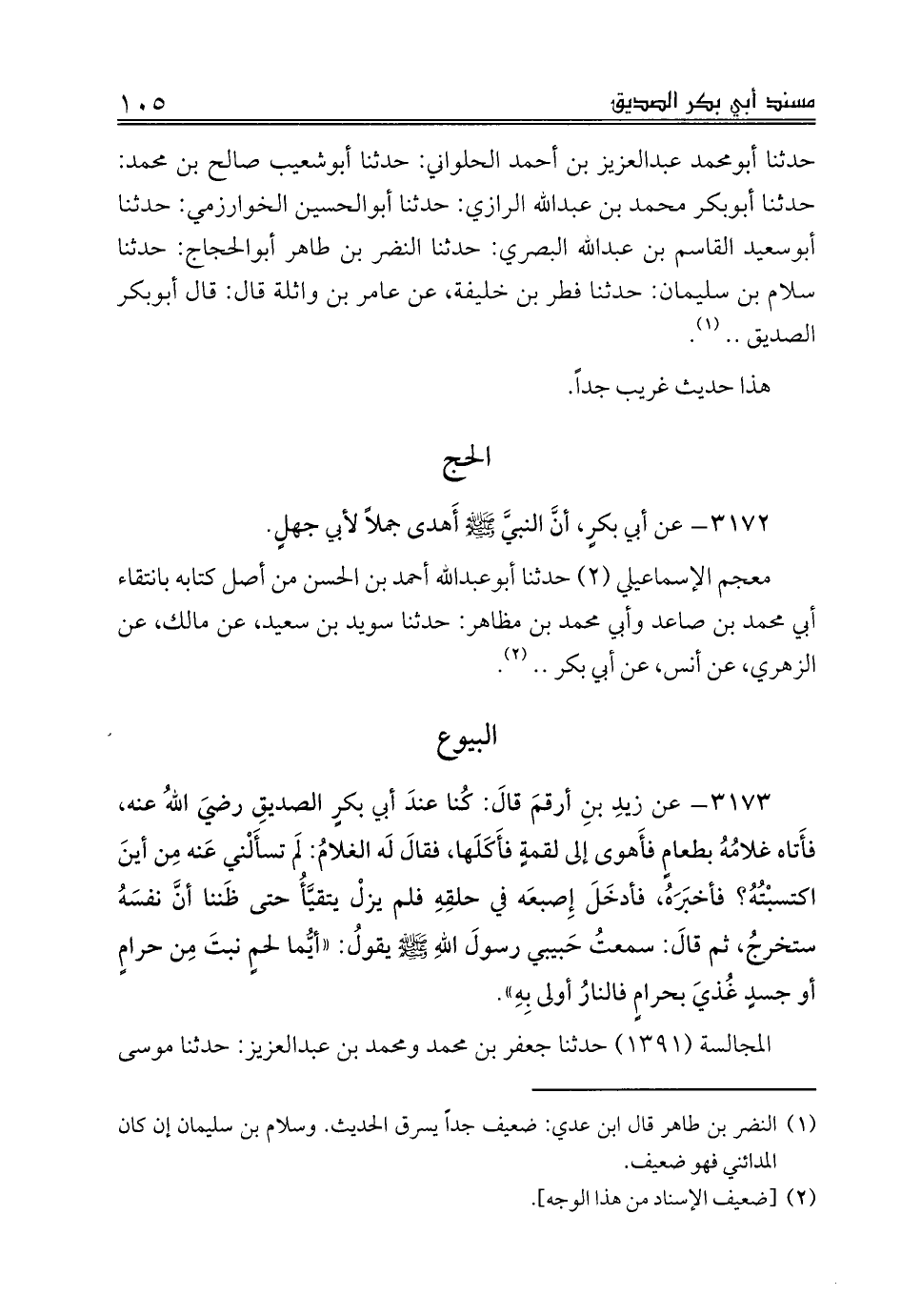 حدثنا أبومحمد عبدالعزيز بن أحمد الحلواني: حدثنا أبوشعيب صالح بن محمد: حدثنا أبوبكر محمد بن عبدالله الرازي: حدثنا أبوالحسين الخوارزمي: حدثنا أبوسعيد القاسم بن عبدالله البصري: حدثنا النضر بن طاهر أبوالحجاج: حدثنا سلام بن سليمان: حدثنا فطر بن خليفة، عن عامر بن واثلة قال: قال أبوبكر الصديق .. (¬1).