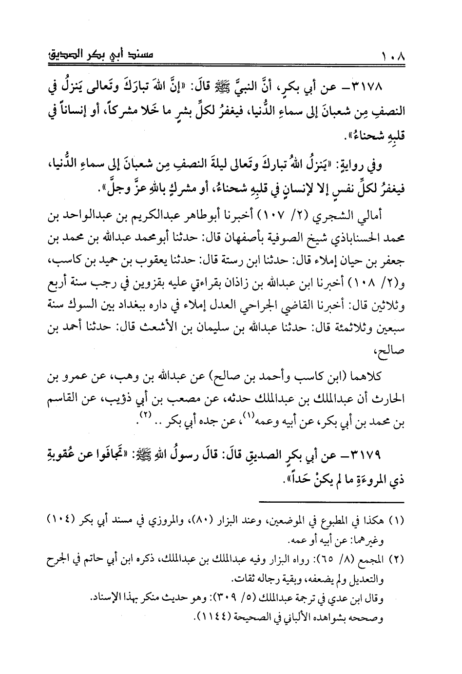 3178 - عن أبي بكرٍ، أنَّ النبيَّ صلى الله عليه وسلم قالَ: «إنَّ اللهَ تبارَكَ وتَعالى ينزلُ في النصفِ مِن شعبانَ إلى سماءِ الدُّنيا، فيغفرُ لكلِّ بشرٍ ما خَلا مشركاً، أو إنساناً في قلبِهِ شحناءُ».