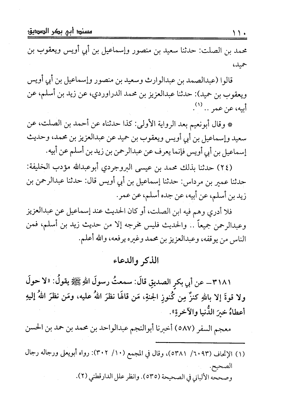 قالوا (عبدالصمد بن عبدالوارث وسعيد بن منصور وإسماعيل بن أبي أويس ويعقوب بن حميد): حدثنا عبدالعزيز بن محمد الدراوردي، عن زيد بن أسلم، عن أبيه، عن عمر .. (¬1).
