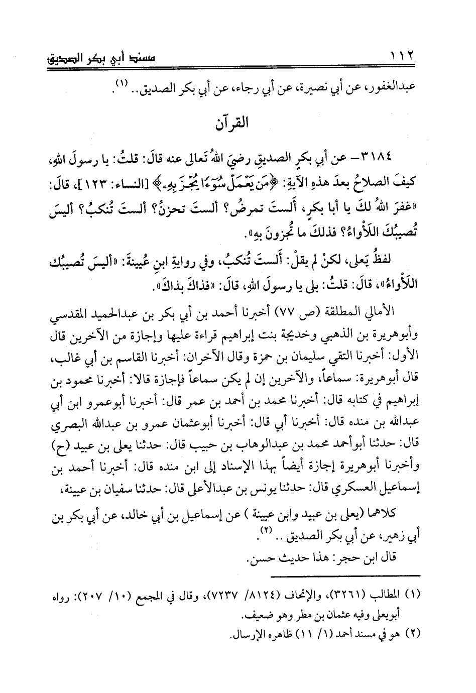 3184 - عن أبي بكرٍ الصديقِ رضيَ اللهُ تَعالى عنه قالَ: قلتُ: يا رسولَ اللهِ، كيفَ الصلاحُ بعدَ هذهِ الآيةِ: {مَنْ يَعْمَلْ سُوءًا يُجْزَ بِهِ} [النساء: 123]، قالَ: «غفرَ اللهُ لكَ يا أبا بكرٍ، أَلستَ تمرضُ؟ ألستَ تحزنُ؟ ألستَ تُنكبُ؟ أليسَ تُصيبُكَ اللَأْواءُ؟ فذلكَ ما تُجزونَ بهِ».