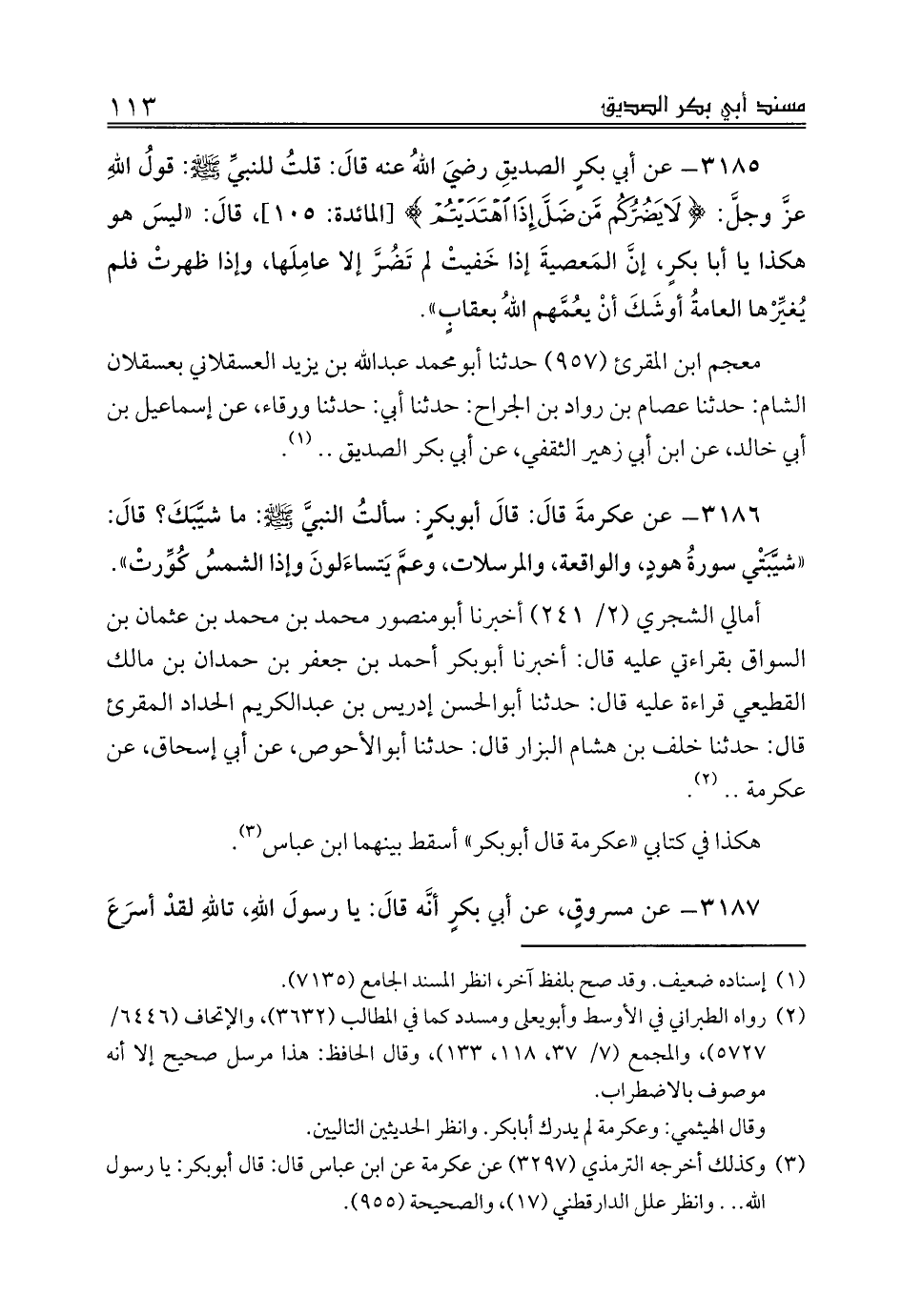 (¬3) وكذلك أخرجه الترمذي (3297) عن عكرمة عن ابن عباس قال: قال أبوبكر: يا رسول الله .. . وانظر علل الدارقطني (17)، والصحيحة (955).