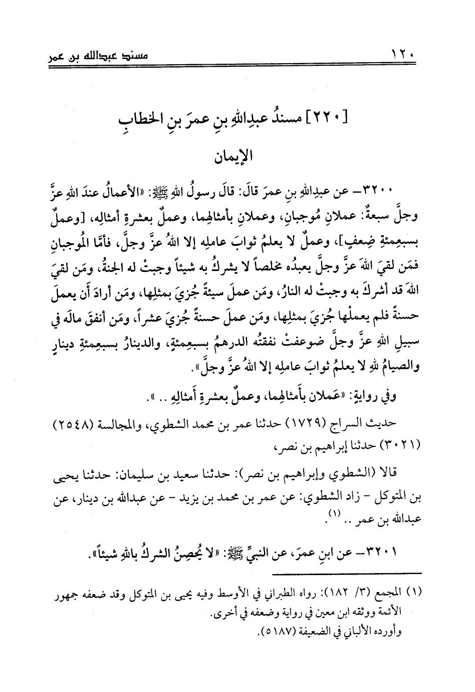 3200 - عن عبدِاللهِ بنِ عمرَ قالَ: قالَ رسولُ اللهِ صلى الله عليه وسلم: «الأعمالُ عندَ اللهِ عزَّ وجلَّ سبعةٌ: عملانِ مُوجبانِ، وعملانِ بأمثالِهما، وعملٌ بعشرةِ أمثالِه، [وعملٌ بسبعِمئةِ ضِعفٍ]، وعملٌ لا يعلمُ ثوابَ عاملِه إلا اللهُ عزَّ وجلَّ، فأمَّا المُوجبانِ فمَن لقيَ اللهَ عزَّ وجلَّ يعبدُه مخلصاً لا يشركُ به شيئاً وجبتْ له الجنةُ، ومَن لقيَ اللهَ قد أشركَ به وجبتْ له النارُ، ومَن عملَ سيئةً جُزيَ بمثلِها، ومَن أرادَ أَن يعملَ حسنةً فلم يعملْها جُزيَ بمثلِها، ومَن عملَ حسنةً جُزيَ عشراً، ومَن أنفقَ مالَه في سبيلِ اللهِ عزَّ وجلَّ ضوعفتْ نفقتُه الدرهمُ بسبعِمئةٍ، والدينارُ بسبعِمئةِ دينارٍ والصيامُ للهِ لا يعلمُ ثوابَ عاملِه إلا اللهُ عزَّ وجلَّ».