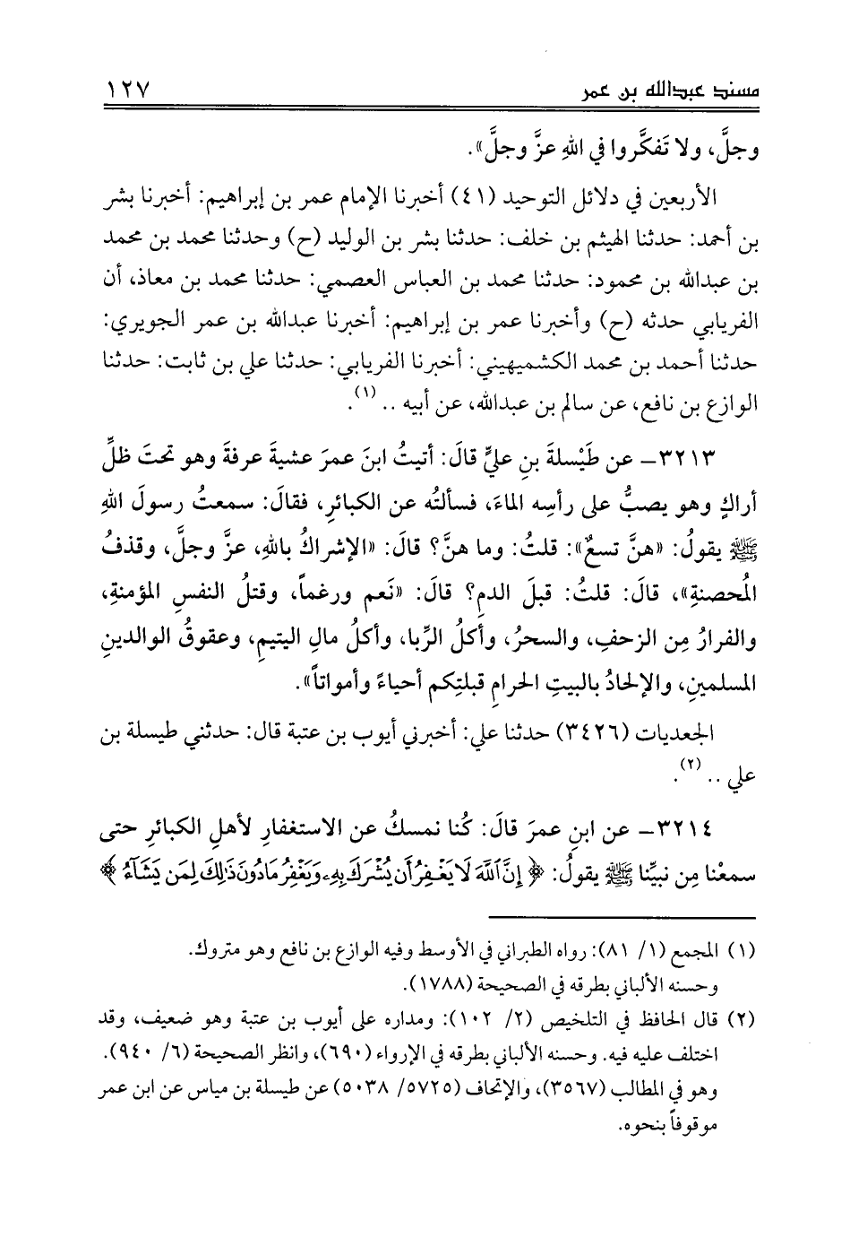 3213 - عن طَيْسلةَ بنِ عليٍّ قالَ: أتيتُ ابنَ عمرَ عشيةَ عرفةَ وهو تحتَ ظلِّ أراكٍ وهو يصبُّ على رأسِه الماءَ، فسألتُه عن الكبائرِ، فقالَ: سمعتُ رسولَ اللهِ صلى الله عليه وسلم يقولُ: «هنَّ تسعٌ»: قلتُ: وما هنَّ؟ قالَ: «الإشراكُ باللهِ، عزَّ وجلَّ، وقذفُ المُحصنةِ»، قالَ: قلتُ: قبلَ الدمِ؟ قالَ: «نَعم ورغماً، وقتلُ النفسِ المؤمنةِ، والفرارُ مِن الزحفِ، والسحرُ، وأكلُ الرِّبا، وأكلُ مالِ اليتيمِ، وعقوقُ الوالدينِ المسلمينِ، والإلحادُ بالبيتِ الحرامِ قبلتِكم أحياءً وأمواتاً».