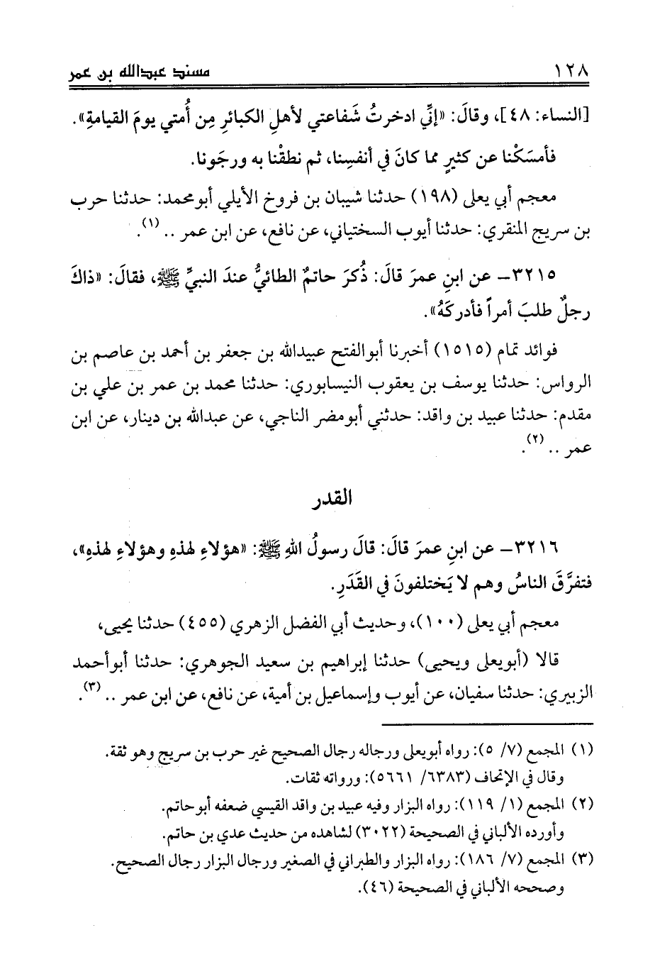 قالا (أبويعلى ويحيى) حدثنا إبراهيم بن سعيد الجوهري: حدثنا أبوأحمد الزبيري: حدثنا سفيان، عن أيوب وإسماعيل بن أمية، عن نافع، عن ابن عمر .. (¬3).