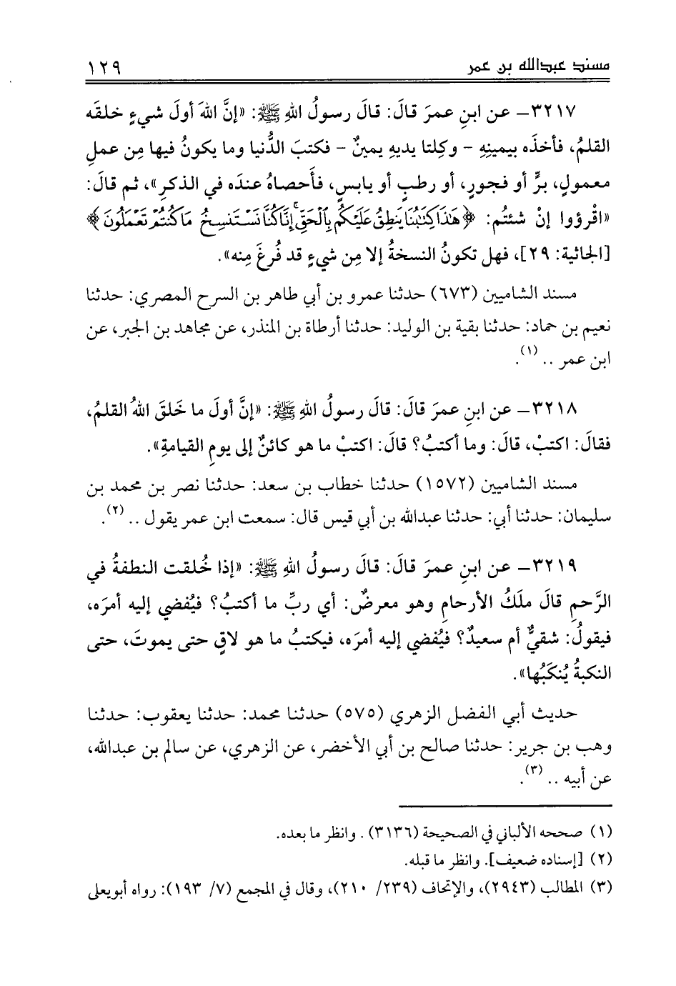 3218 - عن ابنِ عمرَ قالَ: قالَ رسولُ اللهِ صلى الله عليه وسلم: «إنَّ أولَ ما خَلقَ اللهُ القلمَ، فقالَ: اكتبْ، قالَ: وما أكتبُ؟ قالَ: اكتبْ ما هو كائنٌ إلى يومِ القيامةِ».