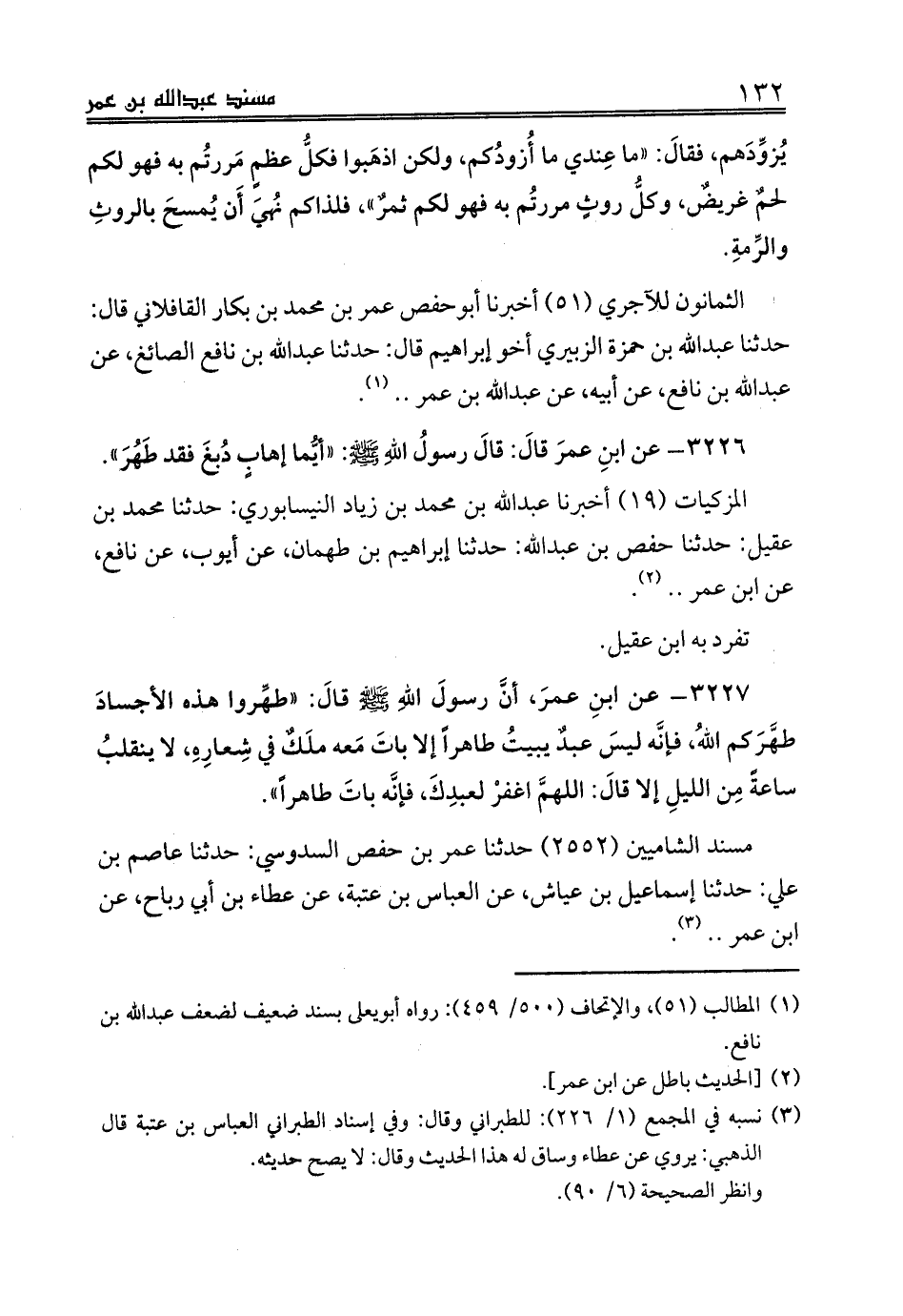3226 - عن ابنِ عمرَ قالَ: قالَ رسولُ اللهِ صلى الله عليه وسلم: «أيُّما إهابٍ دُبغَ فقد طَهُرَ».