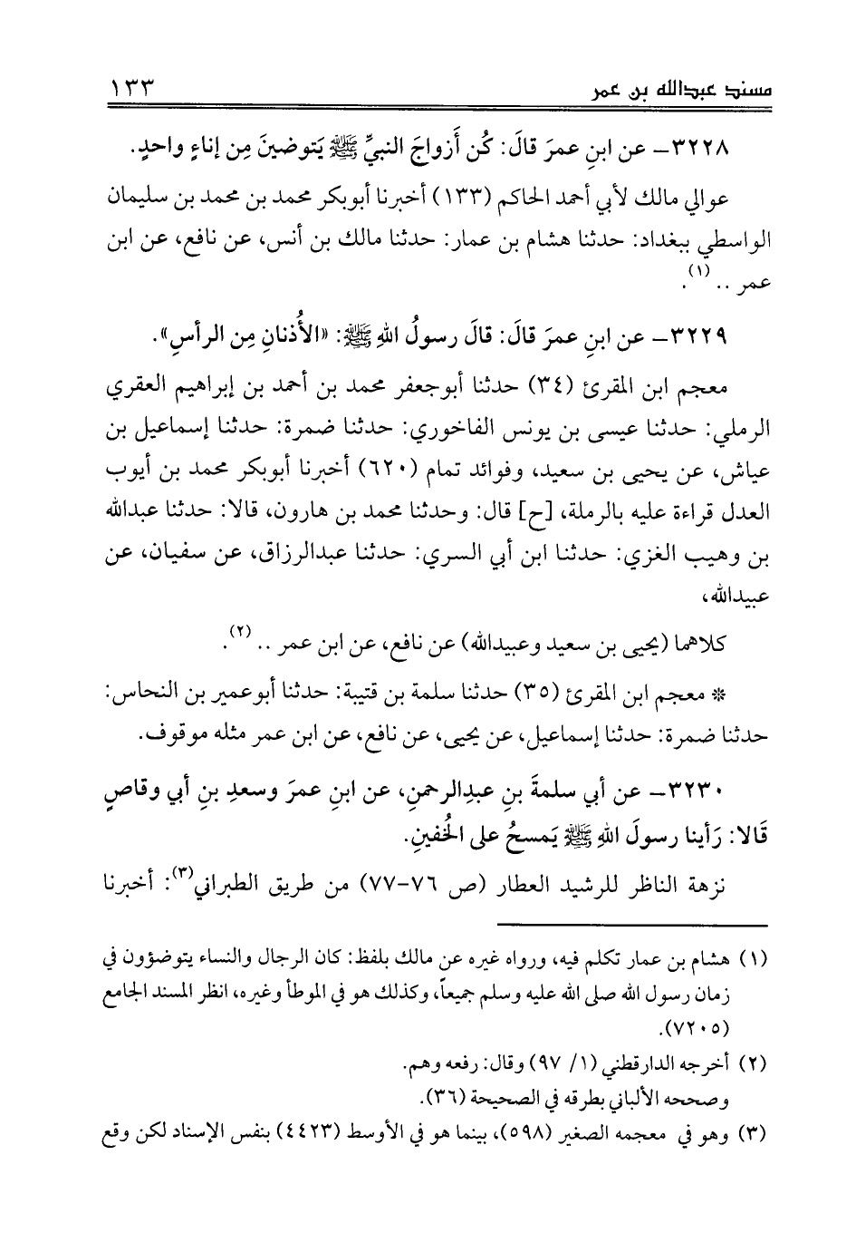 3229 - عن ابنِ عمرَ قالَ: قالَ رسولُ اللهِ صلى الله عليه وسلم: «الأُذنانِ مِن الرأسِ».