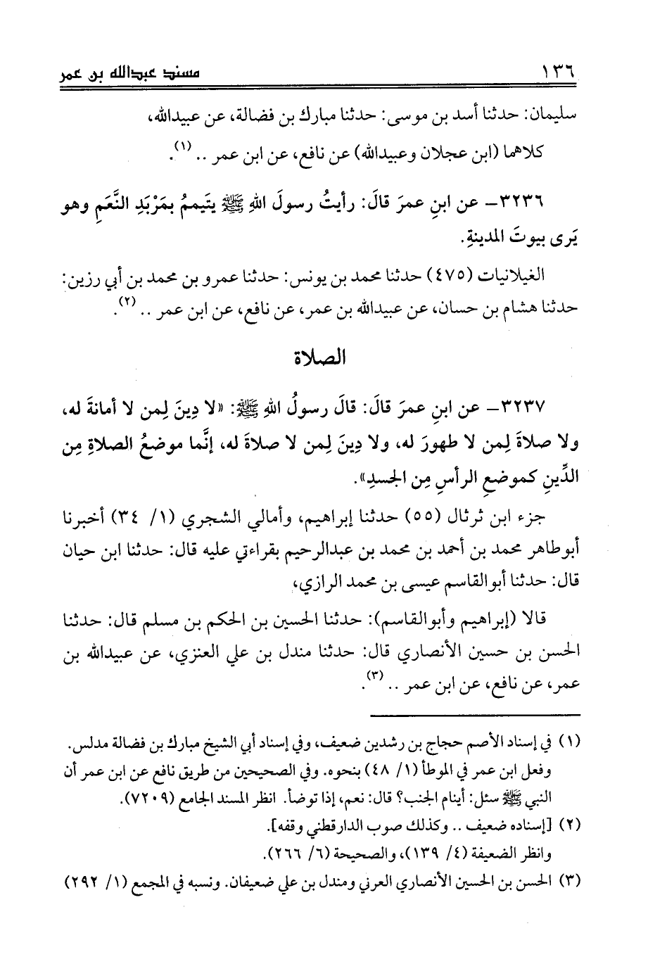 3237 - عن ابنِ عمرَ قالَ: قالَ رسولُ اللهِ صلى الله عليه وسلم: «لا دِينَ لِمن لا أمانةَ له، ولا صلاةَ لِمن لا طهورَ له، ولا دِينَ لِمن لا صلاةَ له، إنَّما موضعُ الصلاةِ مِن الدِّينِ كموضعِ الرأسِ مِن الجسدِ».