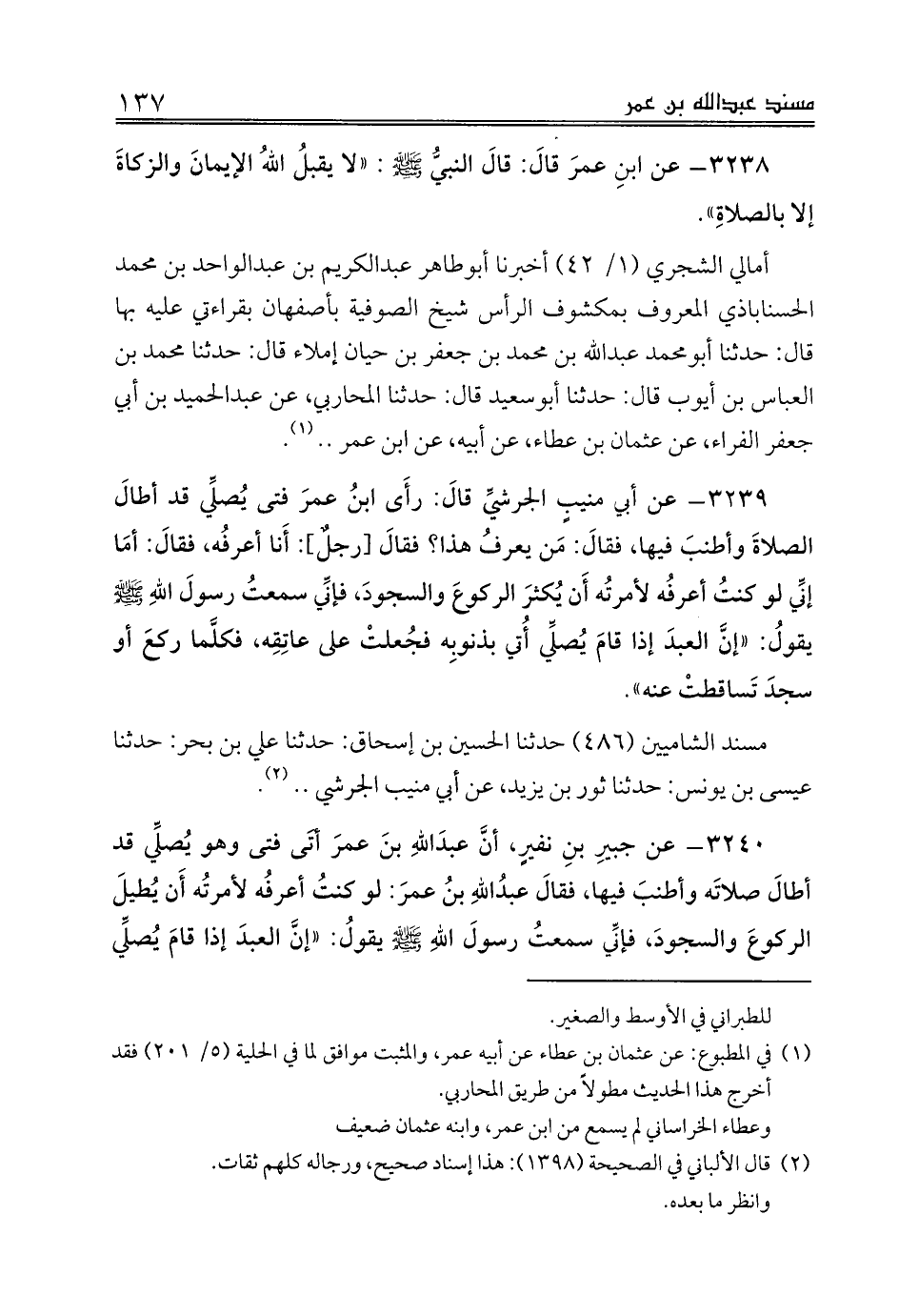 3240 - عن جبيرِ بنِ نفيرٍ، أنَّ عبدَاللهِ بنَ عمرَ أتَى فتى وهو يُصلِّي قد أطالَ صلاتَه وأطنبَ فيها، فقالَ عبدُاللهِ بنُ عمرَ: لو كنتُ أعرفُه لأمرتُه أَن يُطيلَ الركوعَ والسجودَ، فإنِّي سمعتُ رسولَ اللهِ صلى الله عليه وسلم يقولُ: «إنَّ العبدَ إذا قامَ يُصلِّي