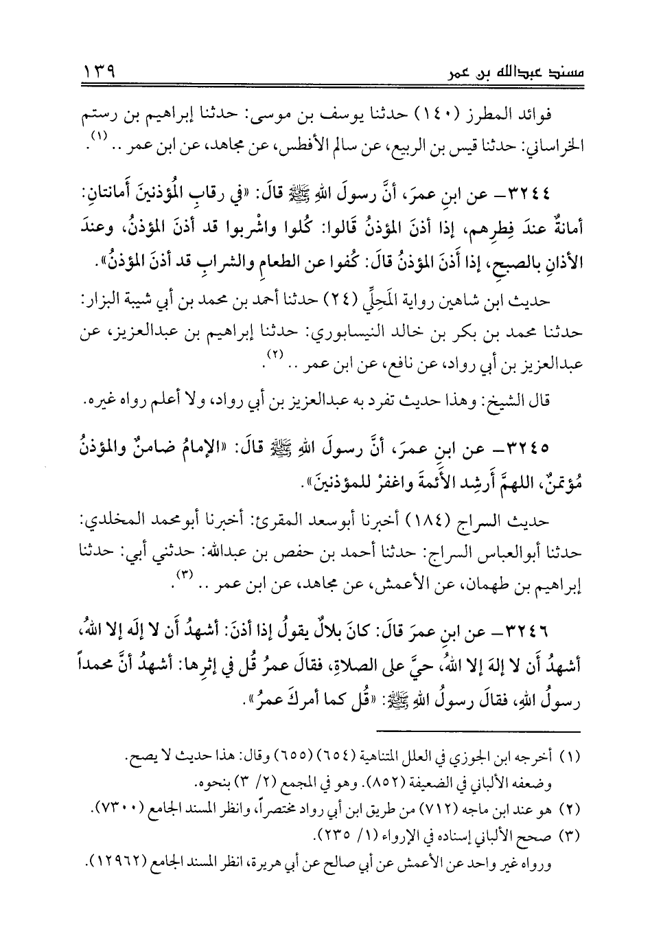 حديث السراج (184) أخبرنا أبوسعد المقرئ: أخبرنا أبومحمد المخلدي: حدثنا أبوالعباس السراج: حدثنا أحمد بن حفص بن عبدالله: حدثني أبي: حدثنا إبراهيم بن طهمان، عن الأعمش، عن مجاهد، عن ابن عمر .. (¬3).