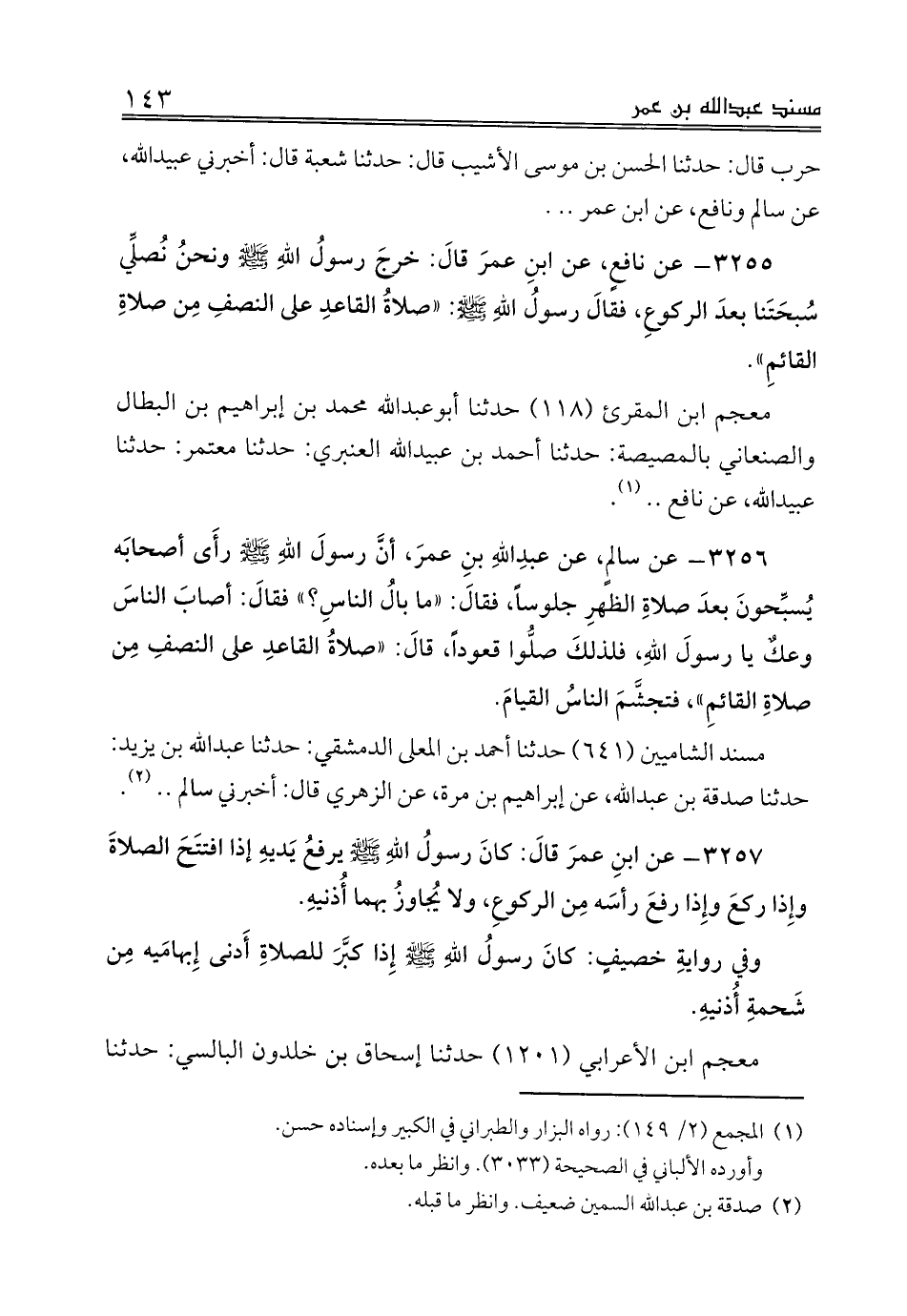 3256 - عن سالمٍ، عن عبدِاللهِ بنِ عمرَ، أنَّ رسولَ اللهِ صلى الله عليه وسلم رأَى أصحابَه يُسبِّحونَ بعدَ صلاةِ الظهرِ جلوساً، فقالَ: «ما بالُ الناسِ؟» فقالَ: أصابَ الناسَ وعكٌ يا رسولَ اللهِ، فلذلكَ صلُّوا قعوداً، قالَ: «صلاةُ القاعدِ على النصفِ مِن صلاةِ القائمِ»، فتجشَّمَ الناسُ القيامَ.