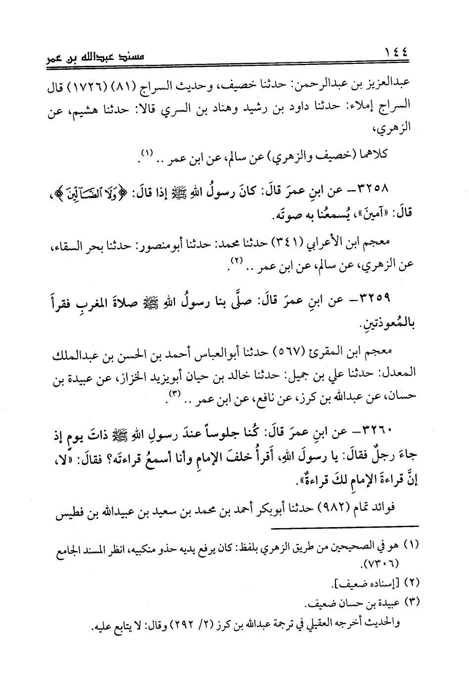 3259 - عن ابنِ عمرَ قالَ: صلَّى بنا رسولُ اللهِ صلى الله عليه وسلم صلاةَ المغربِ فقرأَ بالمُعوذتينِ.