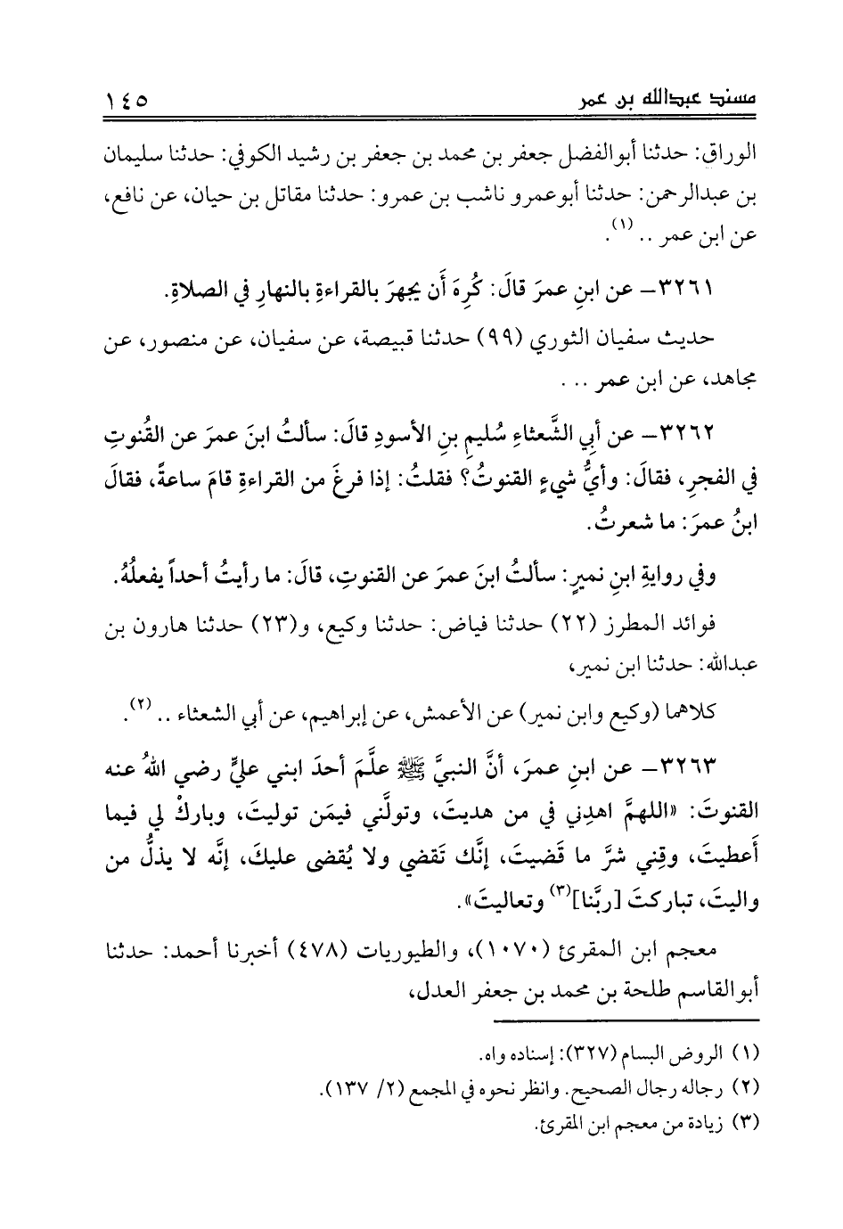 3262 - عن أبِي الشَّعثاءِ سُليمِ بنِ الأسودِ قالَ: سألتُ ابنَ عمرَ عن القُنوتِ في الفجرِ، فقالَ: وأيُّ شيءٍ القنوتُ؟ فقلتُ: إذا فرغَ من القراءةِ قام ساعةً، فقالَ ابنُ عمرَ: ما شعرتُ.