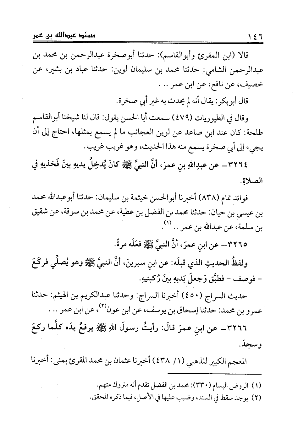 قالا (ابن المقرئ وأبوالقاسم): حدثنا أبوصخرة عبدالرحمن بن محمد بن عبدالرحمن الشامي: حدثنا محمد بن سليمان لوين: حدثنا عباد بن بشير، عن خصيف، عن نافع، عن ابن عمر .. .