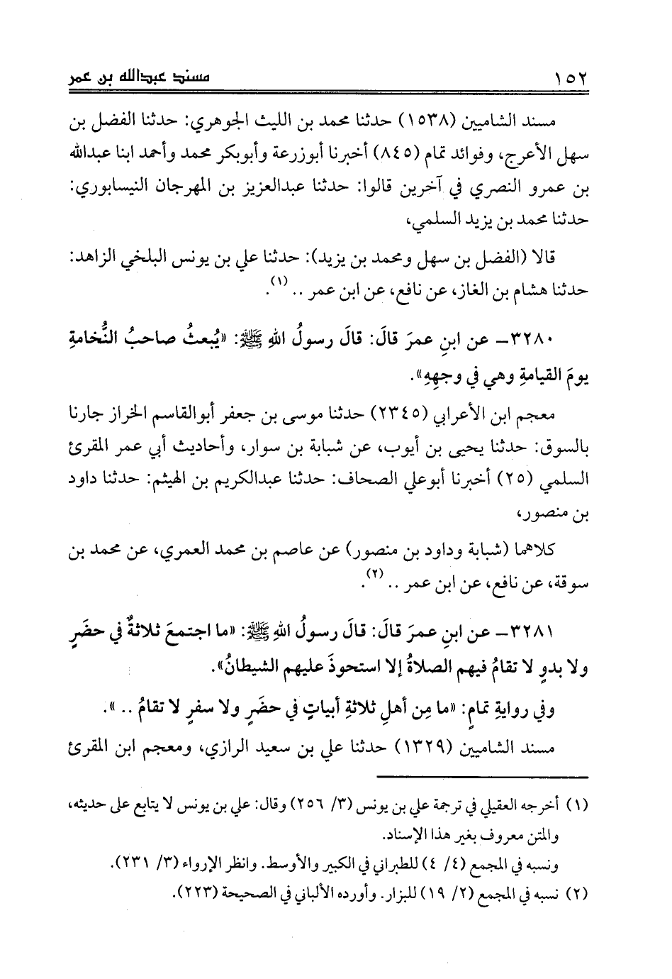 3281 - عن ابنِ عمرَ قالَ: قالَ رسولُ اللهِ صلى الله عليه وسلم: «ما اجتمعَ ثلاثةٌ في حضَرٍ ولا بدوٍ لا تقامُ فيهم الصلاةُ إلا استحوذَ عليهم الشيطانُ».