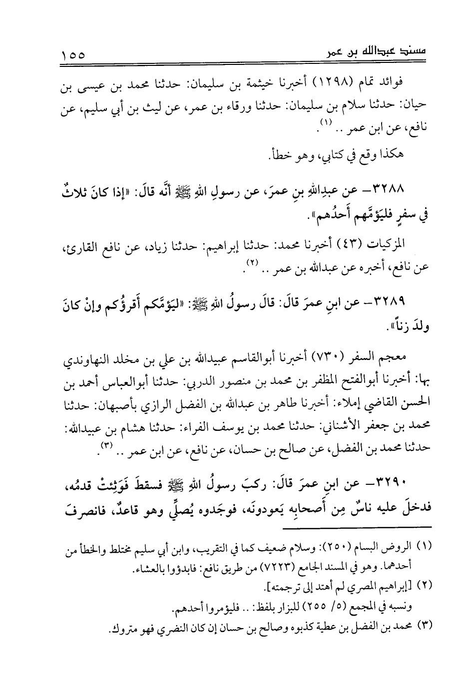 معجم السفر (730) أخبرنا أبوالقاسم عبيدالله بن علي بن مخلد النهاوندي بها: أخبرنا أبوالفتح المظفر بن محمد بن منصور الدربي: حدثنا أبوالعباس أحمد بن الحسن القاضي إملاء: أخبرنا طاهر بن عبدالله بن الفضل الرازي بإصبهان: حدثنا محمد بن جعفر الأشناني: حدثنا محمد بن يوسف الفراء: حدثنا هشام بن عبيدالله: حدثنا محمد بن الفضل، عن صالح بن حسان، عن نافع، عن ابن عمر .. (¬3).