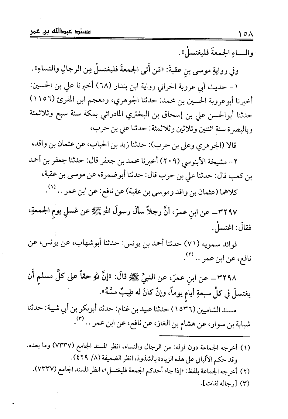3298 - عن ابنِ عمرَ، عن النبيِّ صلى الله عليه وسلم قالَ: «إنَّ للهِ حقاً على كلِّ مسلمٍ أَن يغتسلَ في كلِّ سبعةِ أيامٍ يوماً، وإنْ كانَ له طِيبٌ مسَّهُ».