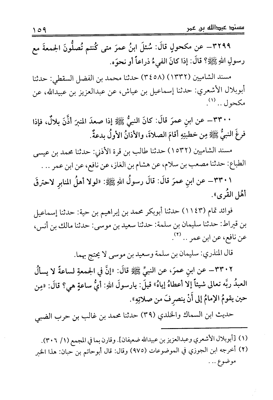 3299 - عن مكحولٍ قالَ: سُئلَ ابنُ عمرَ متى كُنتم تُصلُّونَ الجمعةَ مع رسولِ اللهِ صلى الله عليه وسلم؟ قالَ: إذا كانَ الفيءُ ذراعاً أو نحوَه.