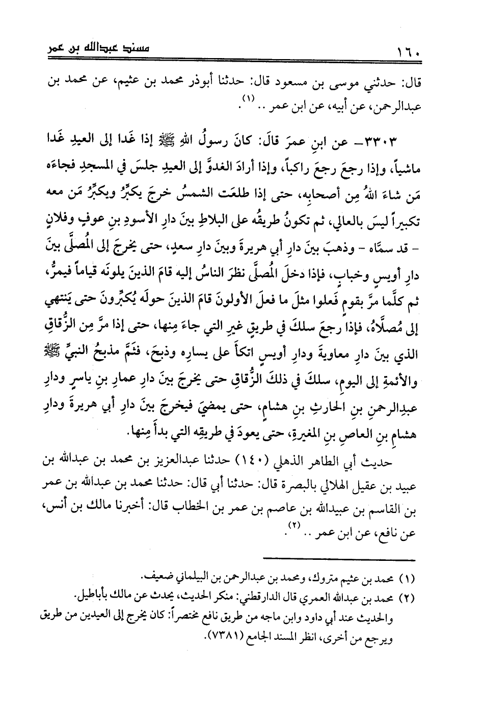 3303 - عن ابنِ عمرَ قالَ: كانَ رسولُ اللهِ صلى الله عليه وسلم إذا غَدا إلى العيدِ غَدا ماشياً، وإذا رجعَ رجعَ راكباً، وإذا أرادَ الغدوَّ إلى العيدِ جلسَ في المسجدِ فجاءَه مَن شاءَ اللهُ مِن أصحابِه، حتى إذا طلعَت الشمسُ خرجَ يكبِّرُ ويكبِّرُ مَن معه تكبيراً ليسَ بالعالي، ثم تكونُ طريقُه على البلاطِ بينَ دارِ الأسودِ بنِ عوفٍ وفلانٍ - قد سمَّاه - وذهبَ بينَ دارِ أبي هريرةَ وبينَ دارِ سعدٍ، حتى يخرجَ إلى المُصلَّى بينَ دارِ أويسٍ وخبابٍ، فإذا دخلَ المُصلَّى نظرَ الناسُ إليه قامَ الذينَ يلونَه قياماً فيمرُّ، ثم كلَّما مرَّ بقومٍ فَعلوا مثلَ ما فعلَ الأولونَ قامَ الذينَ حولَه يُكبِّرونَ حتى يَنتهي إلى مُصلاَّهُ، فإذا رجعَ سلكَ في طريقٍ غيرِ التي جاءَ مِنها، حتى إذا مرَّ مِن الزُّقاقِ الذي بينَ دارِ معاويةَ ودارِ أويسٍ اتكأَ على يسارِه وذبحَ، فثَمَّ مذبحُ النبيِّ صلى الله عليه وسلم والأئمةِ إلى اليومِ، سلكَ في ذلكَ الزُّقاقِ حتى يخرجَ بينَ دارِ عمارِ بنِ ياسرٍ ودارِ عبدِالرحمنِ بنِ الحارثِ بنِ هشامٍ، حتى يمضيَ فيخرجَ بينَ دارِ أبي هريرةَ ودارِ هشامِ بنِ العاصِ بنِ المغيرةِ، حتى يعودَ في طريقِه التي بدأَ مِنها.