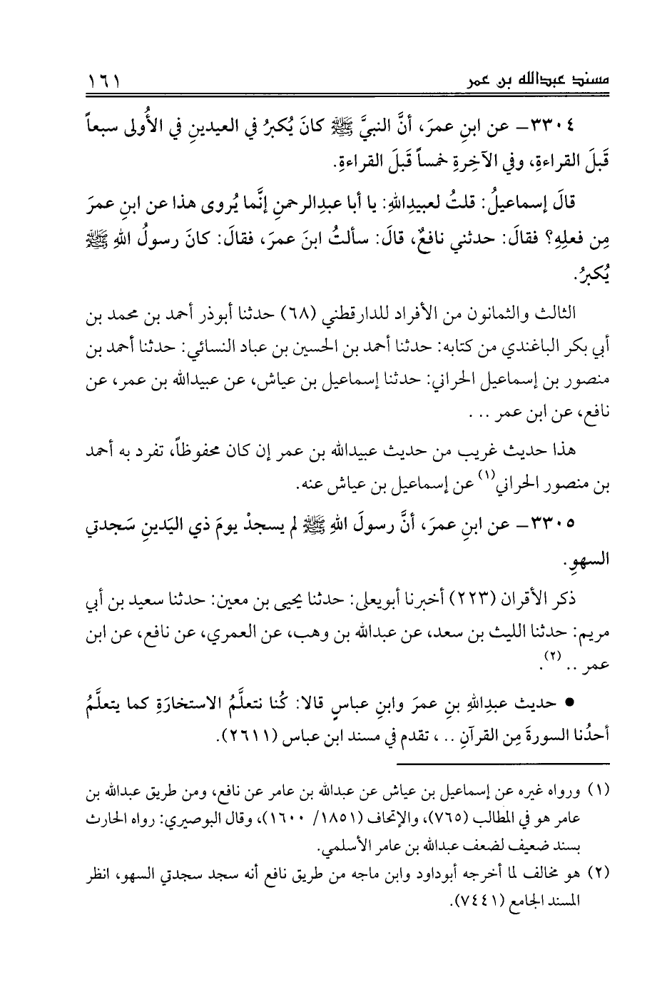 (¬2) هو مخالف لما أخرجه أبوداود وابن ماجه من طريق نافع أنه سجد سجدتي السهو، انظر المسند الجامع (7441).