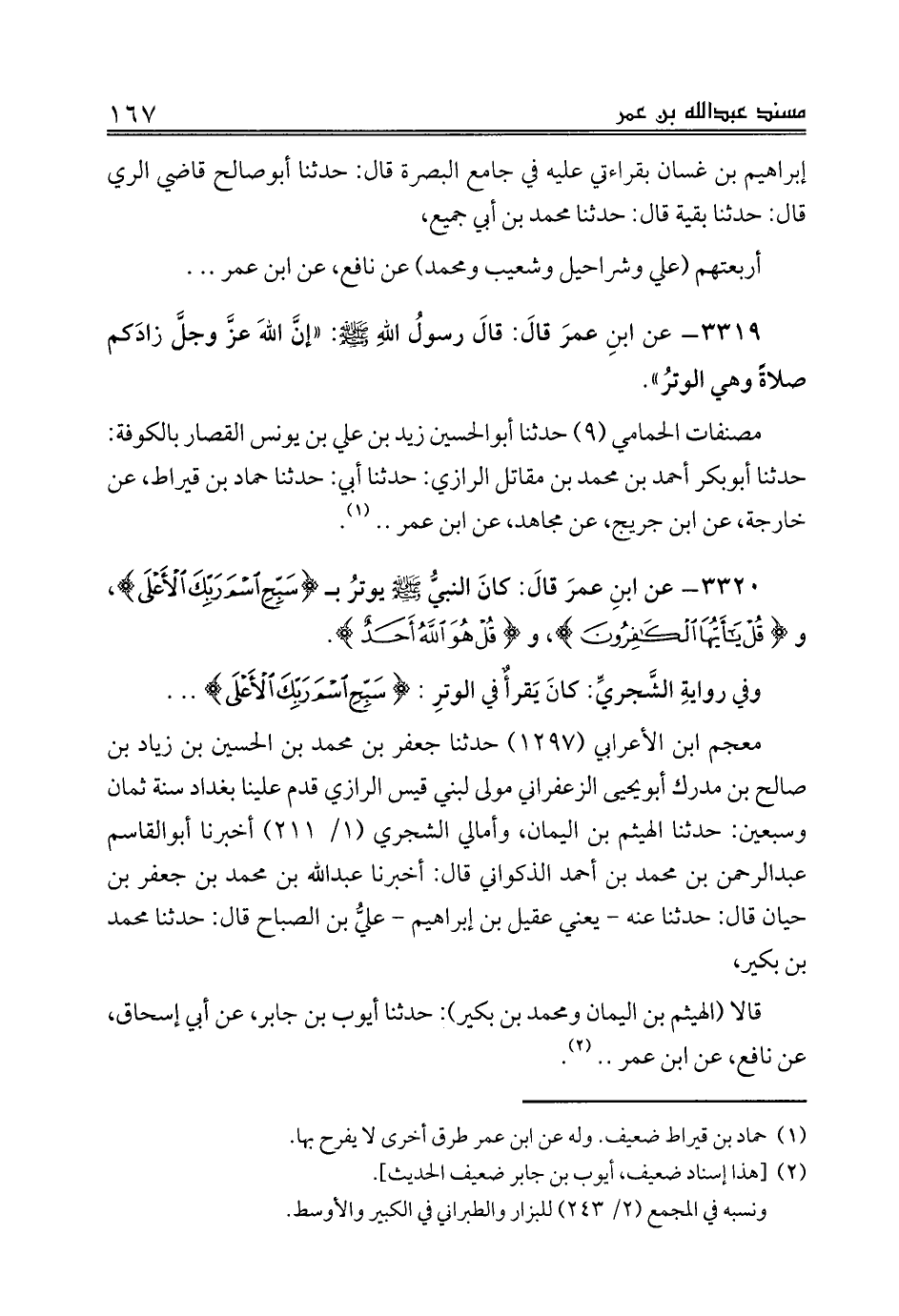 3320 - عن ابنِ عمرَ قالَ: كانَ النبيُّ صلى الله عليه وسلم يوترُ بـ {سَبِّحِ اسْمَ رَبِّكَ الْأَعْلَى}، و {قُلْ يَاأَيُّهَا الْكَافِرُونَ}، و {قُلْ هُوَ اللَّهُ أَحَدٌ}.