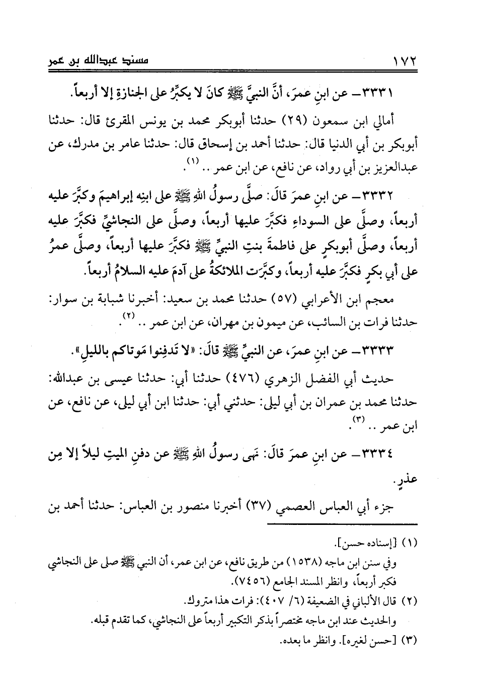3331 - عن ابنِ عمرَ، أنَّ النبيَّ صلى الله عليه وسلم كانَ لا يكبِّرُ على الجنازةِ إلا أربعاً.