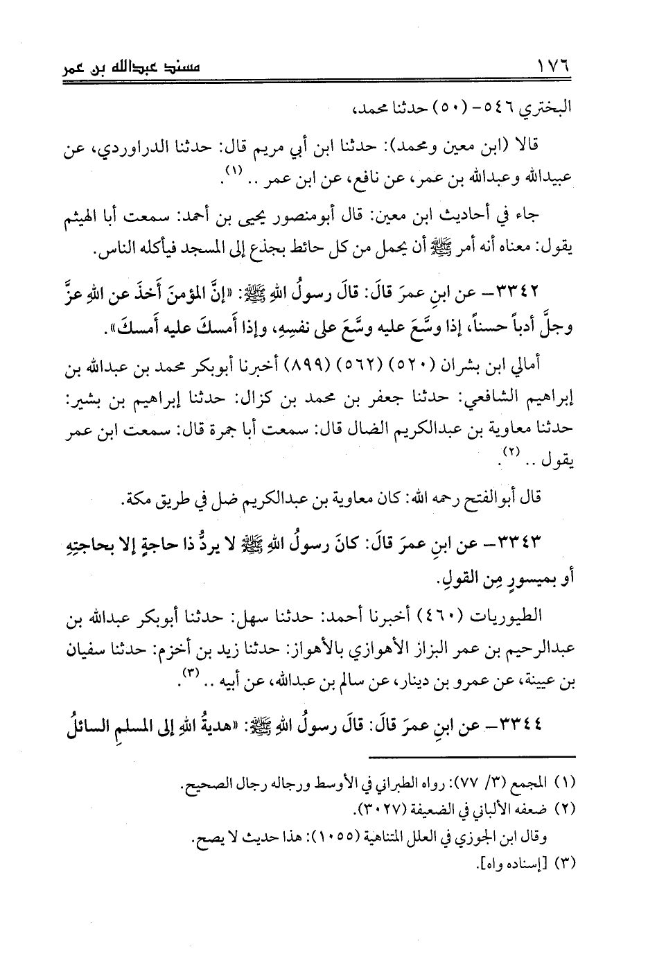 3344 - عن ابنِ عمرَ قالَ: قالَ رسولُ اللهِ صلى الله عليه وسلم: «هديةُ اللهِ إلى المسلمِ السائلُ