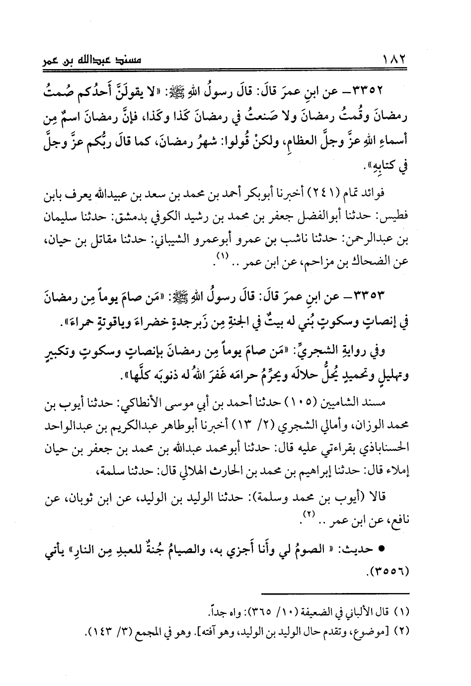 3352 - عن ابنِ عمرَ قالَ: قالَ رسولُ اللهِ صلى الله عليه وسلم: «لا يقولَنَّ أَحدُكم صُمتُ رمضانَ وقُمتُ رمضانَ ولا صَنعتُ في رمضانَ كَذا وكَذا، فإنَّ رمضانَ اسمٌ مِن أسماءِ اللهِ عزَّ وجلَّ العظامِ، ولكنْ قُولوا: شهرُ رمضانَ، كما قالَ ربُّكم عزَّ وجلَّ في كتابِهِ».