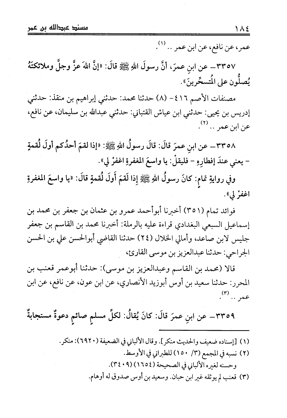 3357 - عن ابنِ عمرَ، أنَّ رسولَ اللهِ صلى الله عليه وسلم قالَ: «إنَّ اللهَ عزَّ وجلَّ وملائكتَهُ يُصلُّون على المُتسحِّرينَ».