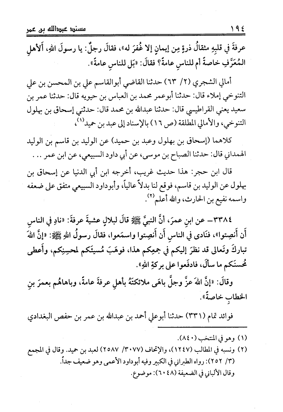 3384 - عن ابنِ عمرَ، أنَّ النبيَّ صلى الله عليه وسلم قالَ لبلالٍ عشيةَ عرفةَ: «نادِ في الناسِ أَن أَنصِتوا»، فنَادى في الناسِ أَن أَنصِتوا واسمَعوا، فقالَ رسولُ اللهِ صلى الله عليه وسلم: «إنَّ اللهَ تباركَ وتَعالى قد نظرَ إليكم في جمعِكم هذا، فوهَبَ مُسيئَكم لمحسِنِكم، وأَعطى مُحسنَكم ما سألَ، فادفَعوا على بركةِ اللهِ».