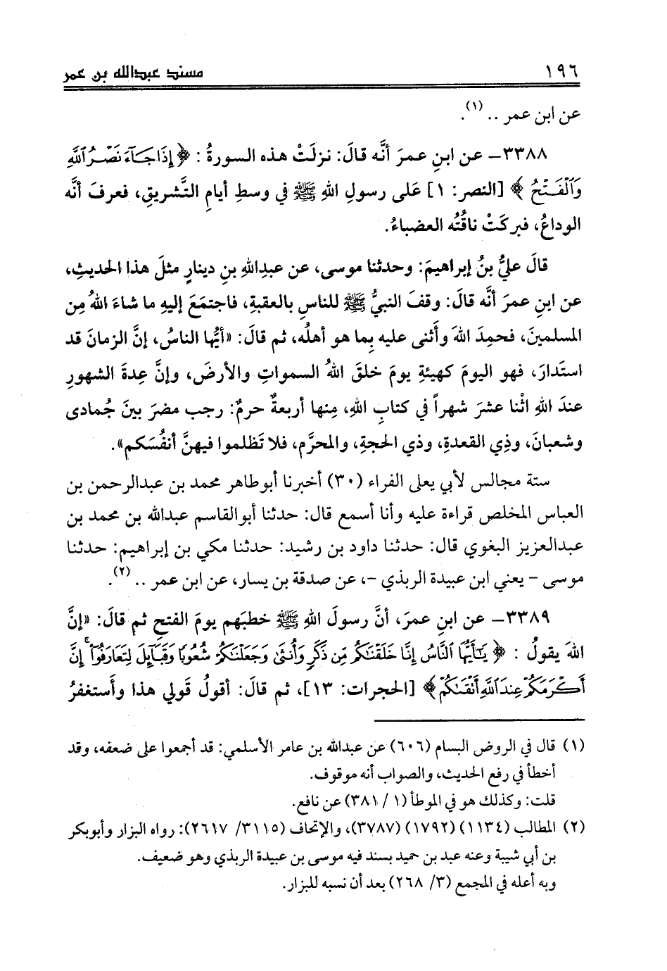 3388 - عن ابنِ عمرَ أنَّه قالَ: نزلَتْ هذه السورةُ: {إِذَا جَاءَ نَصْرُ اللَّهِ وَالْفَتْحُ} [النصر: 1] عَلى رسولِ اللهِ صلى الله عليه وسلم في وسطِ أيامِ التَّشريقِ، فعرفَ أنَّه الوداعُ، فبركَتْ ناقُتُه العضباءُ.