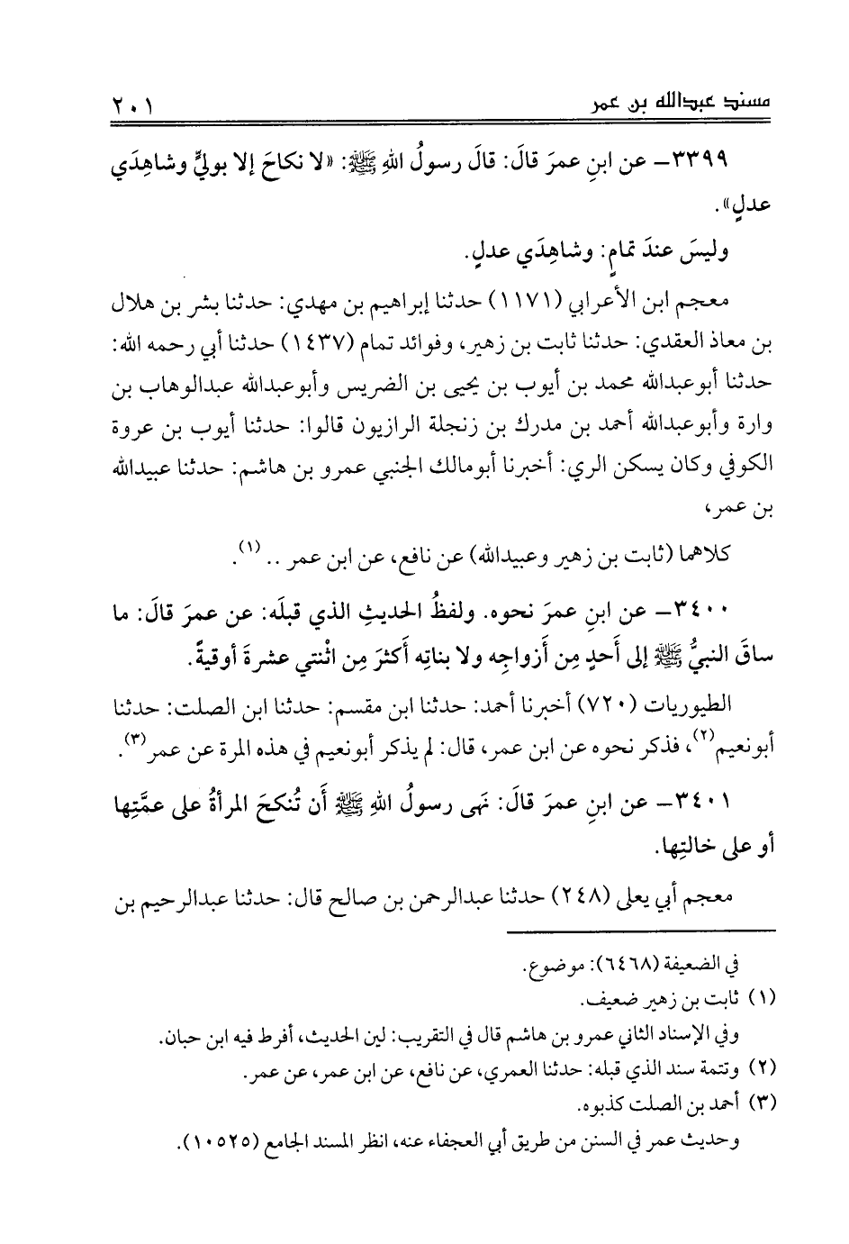 3399 - عن ابنِ عمرَ قالَ: قالَ رسولُ اللهِ صلى الله عليه وسلم: «لا نكاحَ إلا بوليٍّ وشاهِدَي عدلٍ».