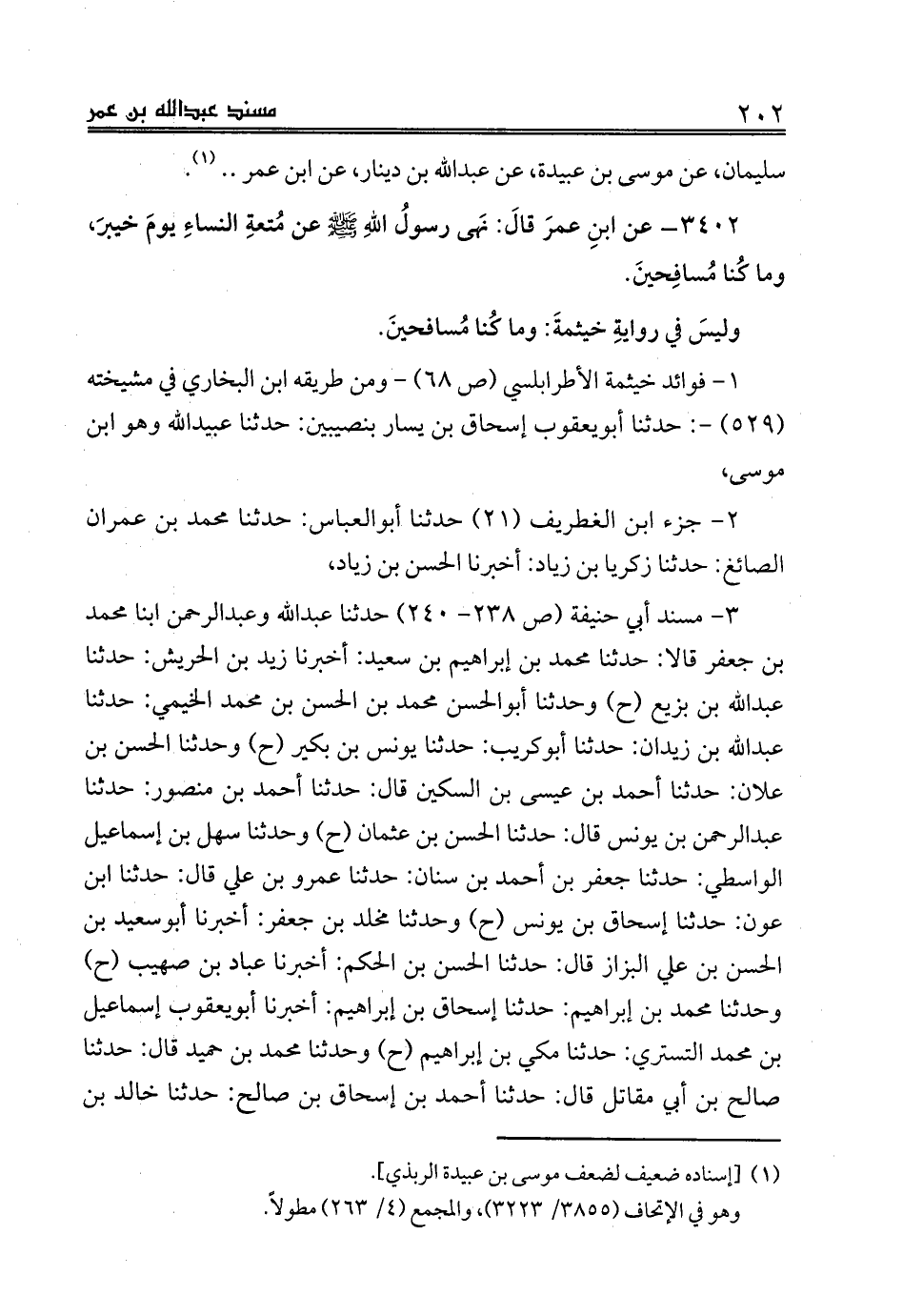 3402 - عن ابنِ عمرَ قالَ: نَهى رسولُ اللهِ صلى الله عليه وسلم عن مُتعةِ النساءِ يومَ خيبرَ، وما كُنا مُسافِحينَ.