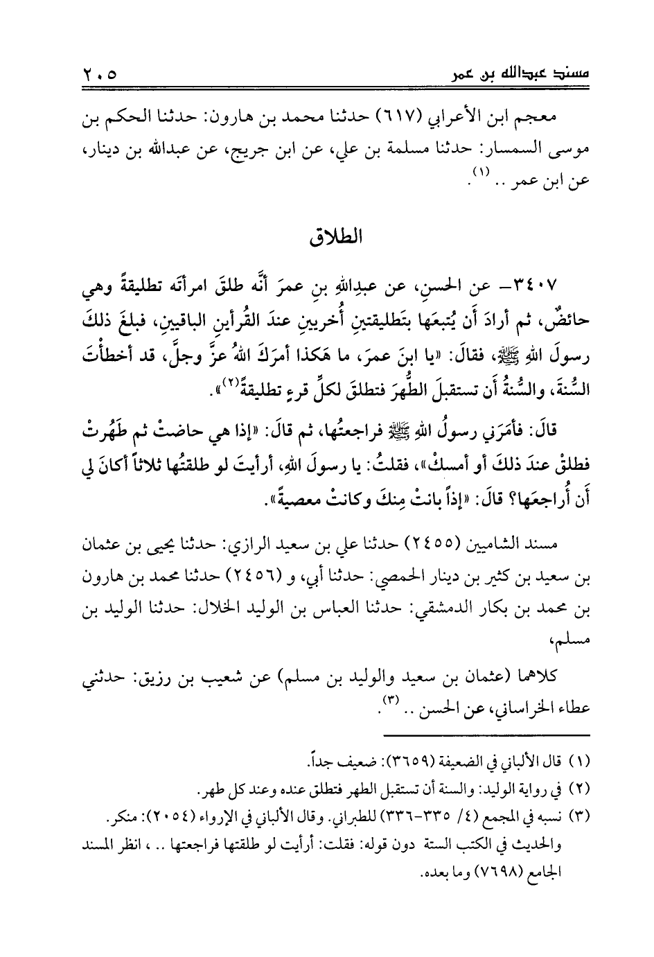 3407 - عن الحسنِ، عن عبدِاللهِ بنِ عمرَ أنَّه طلقَ امرأتَه تطليقةً وهي حائضٌ، ثم أرادَ أَن يُتبعَها بتَطليقتينِ أُخريينِ عندَ القُرأينِ الباقيينِ، فبلغَ ذلكَ رسولَ اللهِ صلى الله عليه وسلم، فقالَ: «يا ابنَ عمرَ، ما هَكذا أمرَكَ اللهُ عزَّ وجلَّ، قد أخطأْتَ السُّنةَ، والسُّنةُ أَن تستقبلَ الطُّهرَ فتطلقَ لكلِّ قرءٍ تطليقةً (¬2)»، قالَ: فأمَرَني رسولُ اللهِ صلى الله عليه وسلم فراجعتُها، ثم قالَ: «إذا هي حاضتْ ثم طَهُرتْ فطلقْ عندَ ذلكَ أو أمسكْ»، فقلتُ: يا رسولَ اللهِ، أرأيتَ لو طلقتُها ثلاثاً أكانَ لي أَن أُراجعَها؟ قالَ: «إذاً بانتْ مِنكَ وكانتْ معصيةً».