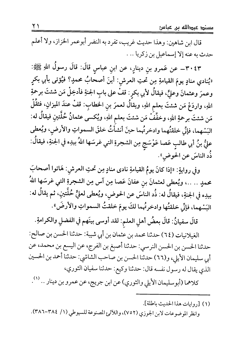3043 - عن عَمرو بنِ دينارٍ، عن ابنِ عباسٍ قالَ: قالَ رسولُ اللهِ صلى الله عليه وسلم: «يُنادي منادٍ يومَ القيامةِ مِن تحتِ العرشِ: أينَ أصحابُ محمدٍ؟ فيُؤتى بأبي بكرٍ وعمرَ وعثمانَ وعليٍّ، فيقالُ لأبي بكرٍ: قفْ على بابِ الجنةِ فأدخِلْ مَن شئتَ برحمةِ اللهِ، واردَعْ مَن شئتَ بعلمِ اللهِ، ويقالُ لعمرَ بنِ الخطابِ: قفْ عندَ الميزانِ، فثقِّلْ مَن شئتَ برحمةِ اللهِ، وخفِّفْ مَن شئتَ بعلمِ اللهِ، ويُكسى عثمانُ حُلَّتينِ فيقالُ له: البَسْهما، فإنِّي خلقتُهما وادخرتُهما حينَ أنشأتُ خلقَ السمواتِ والأرضِ، ويُعطى عليُّ بنُ أبي طالبٍ عَصا عَوْسَجٍ مِن الشجرةِ التي غرسَها اللهُ بيدِه في الجنةِ، فيقالُ: ذُد الناسَ عن الحوضِ».