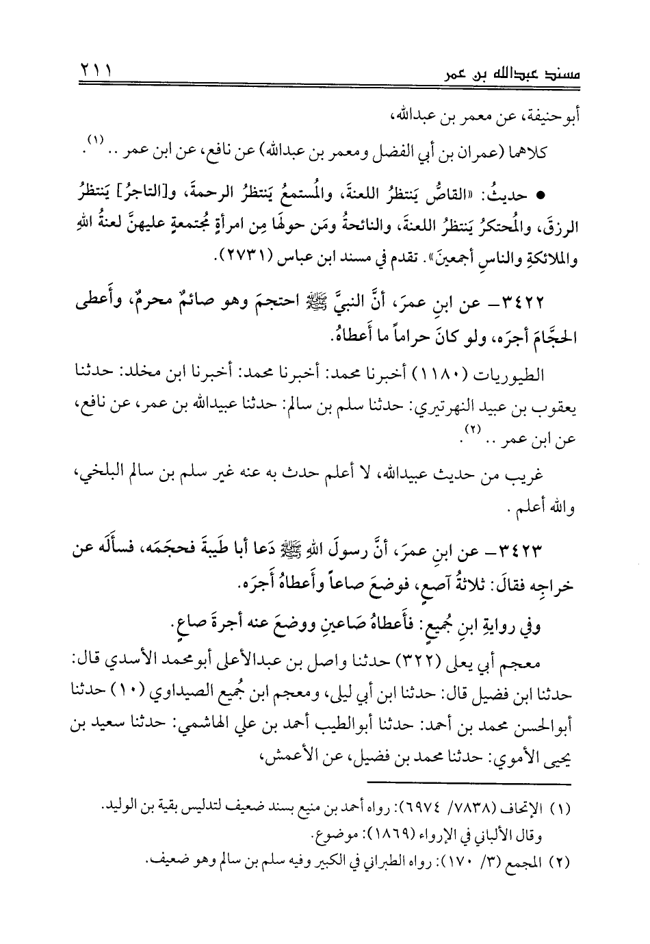 3423 - عن ابنِ عمرَ، أنَّ رسولَ اللهِ صلى الله عليه وسلم دَعا أبا طَيبةَ فحجَمَه، فسأَلَه عن خراجِه فقالَ: ثلاثةُ آصعٍ، فوضعَ صاعاً وأَعطاهُ أَجرَه.