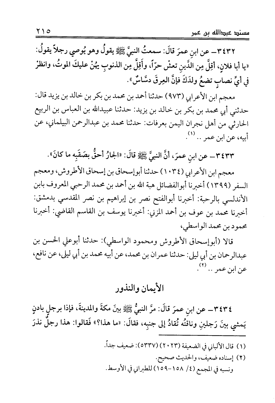 3434 - عن ابنِ عمرَ قالَ: مرَّ النبيُّ صلى الله عليه وسلم بينَ مكةَ والمدينةَ، فإذا برجلٍ بادنٍ يَمشي بينَ رَجلينِ وناقتُه تُقادُ إلى جنبِه، فقالَ: «ما هذا؟» فَقالوا: هذا رجلٌ نذرَ