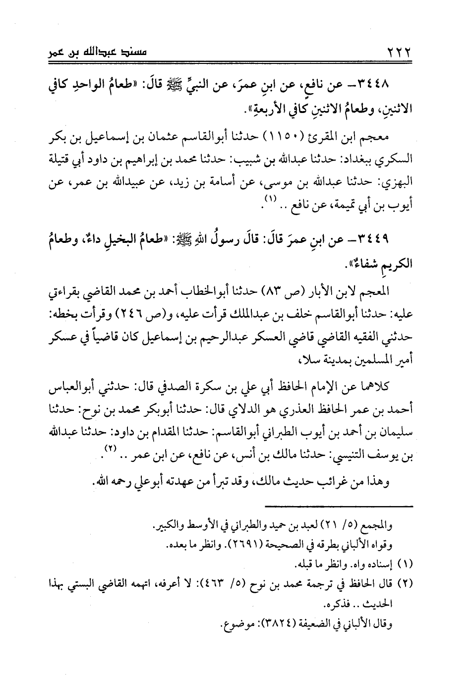 3449 - عن ابنِ عمرَ قالَ: قالَ رسولُ اللهِ صلى الله عليه وسلم: «طعامُ البخيلِ داءٌ، وطعامُ الكريمِ شفاءٌ».